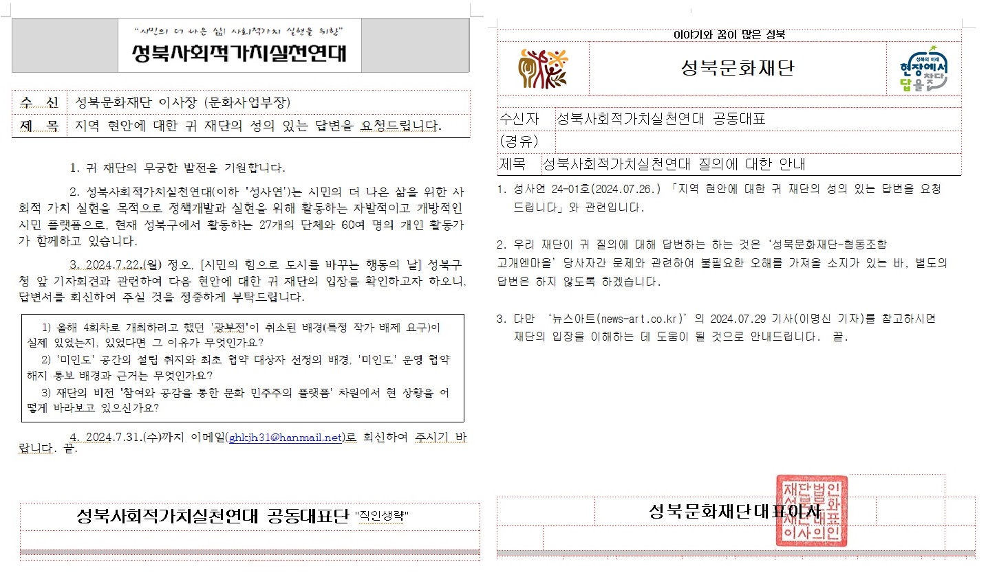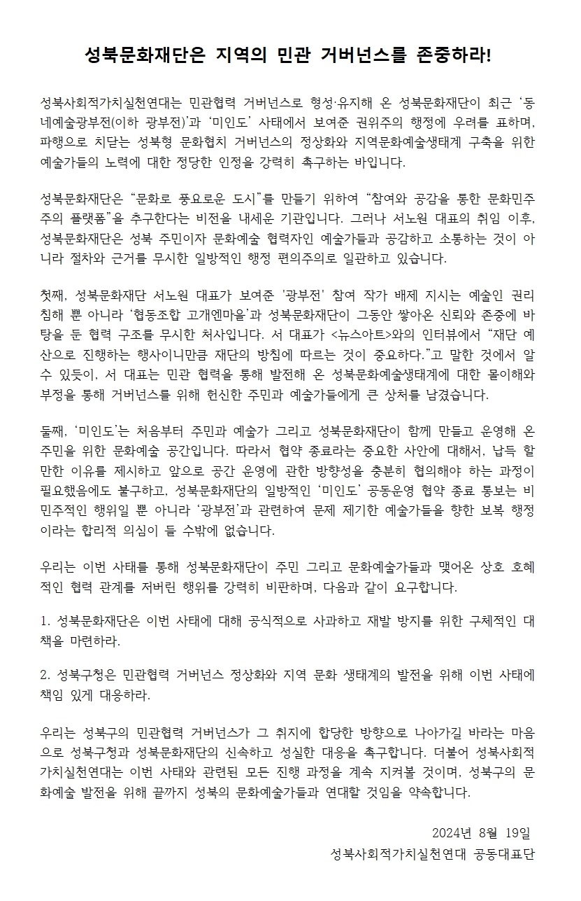 [입장문-성북사회적가치실천연대] 성북문화재단은 지역의 민관 거버넌스를 존중하라!