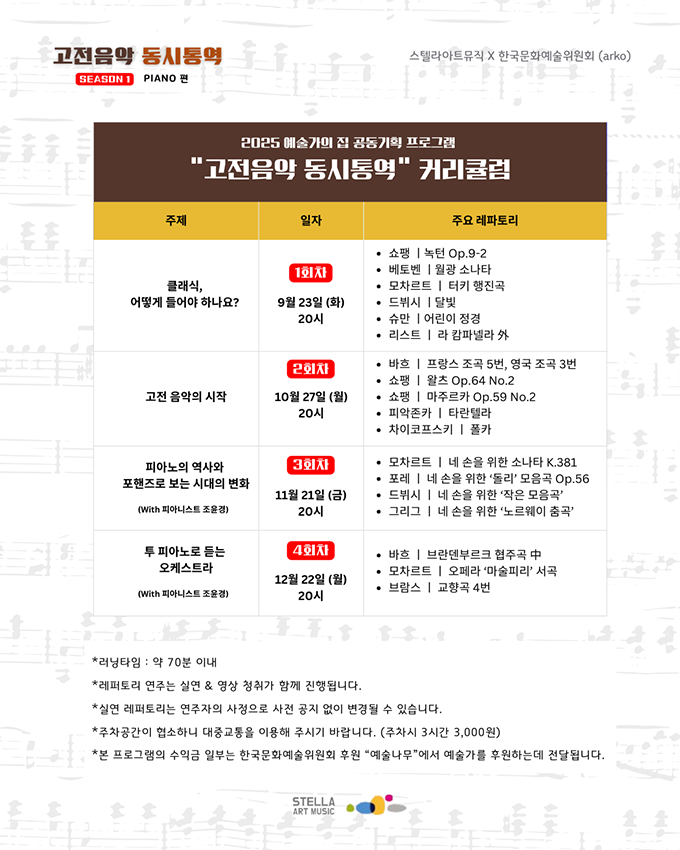 - 3회차: 11월 21일 (금) 20시 〈피아노의 역사와 포핸즈로 보는 시대의 변화〉 (with 피아니스트 조윤경)