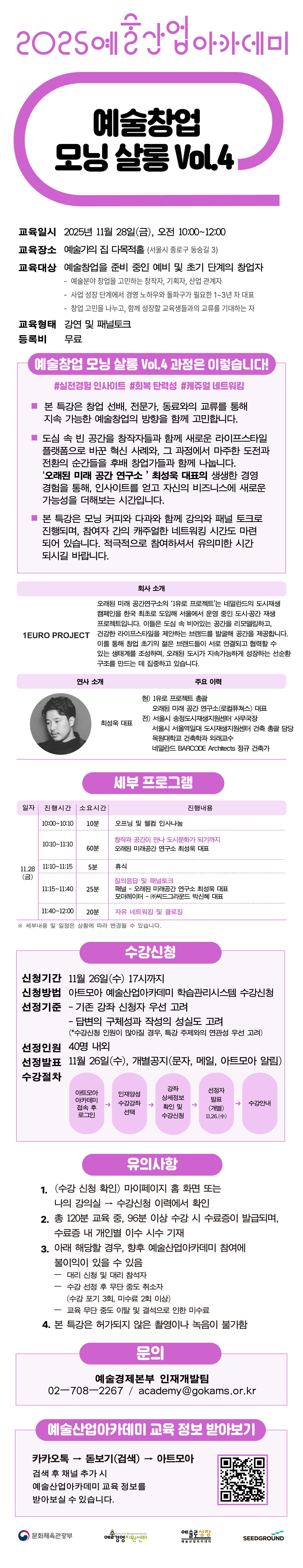 2025 예술산업아카데미 <예술창업 모닝 살롱 Vol. 4> 수강생 모집