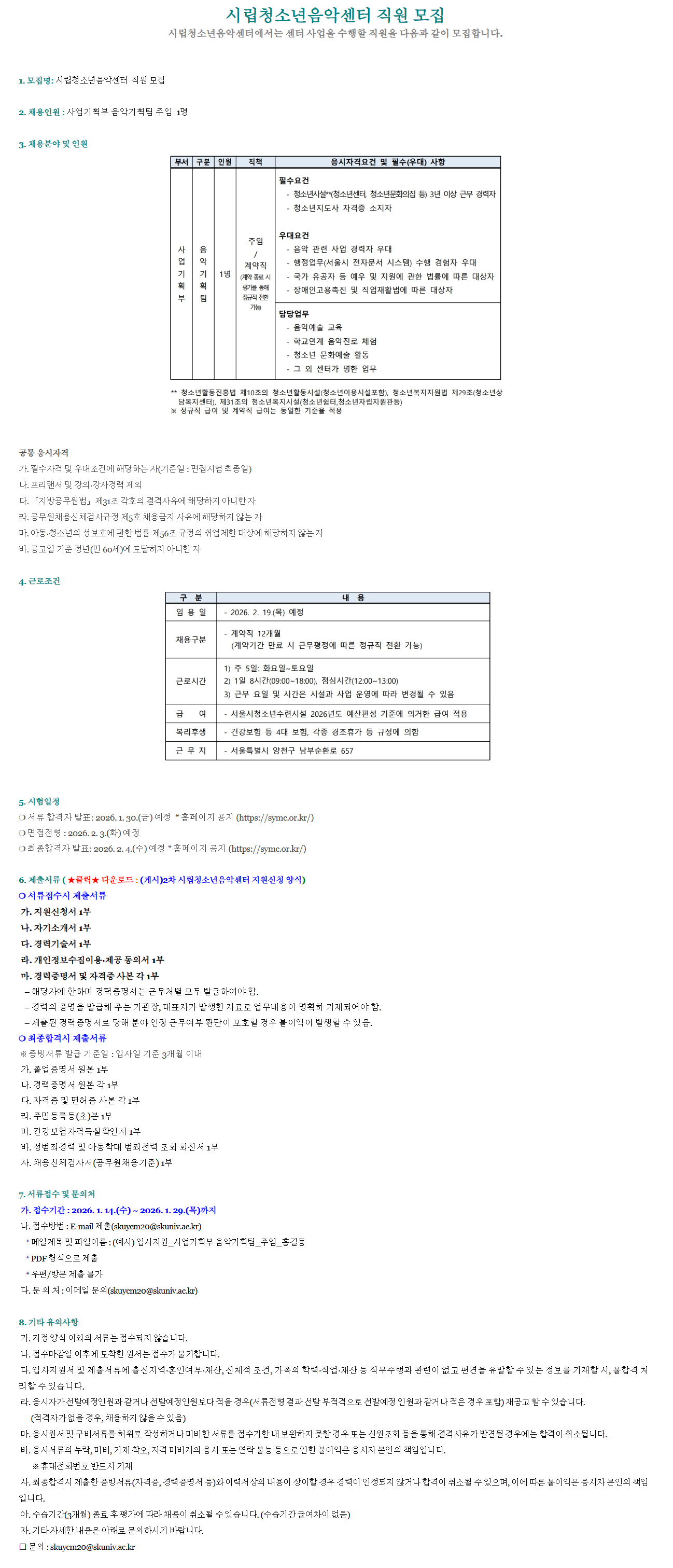 시립청소년음악센터 사업기획부 음악기획팀 주임 채용