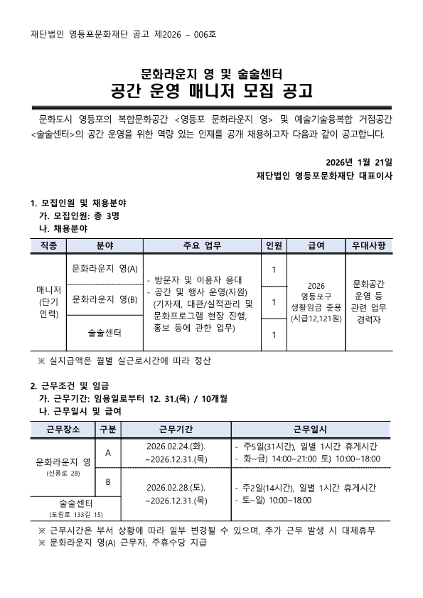 ❍서류발표:2026. 2. 4.(수)예정(※영등포문화재단 홈페이지 게시 및 대상자 개별 안내)