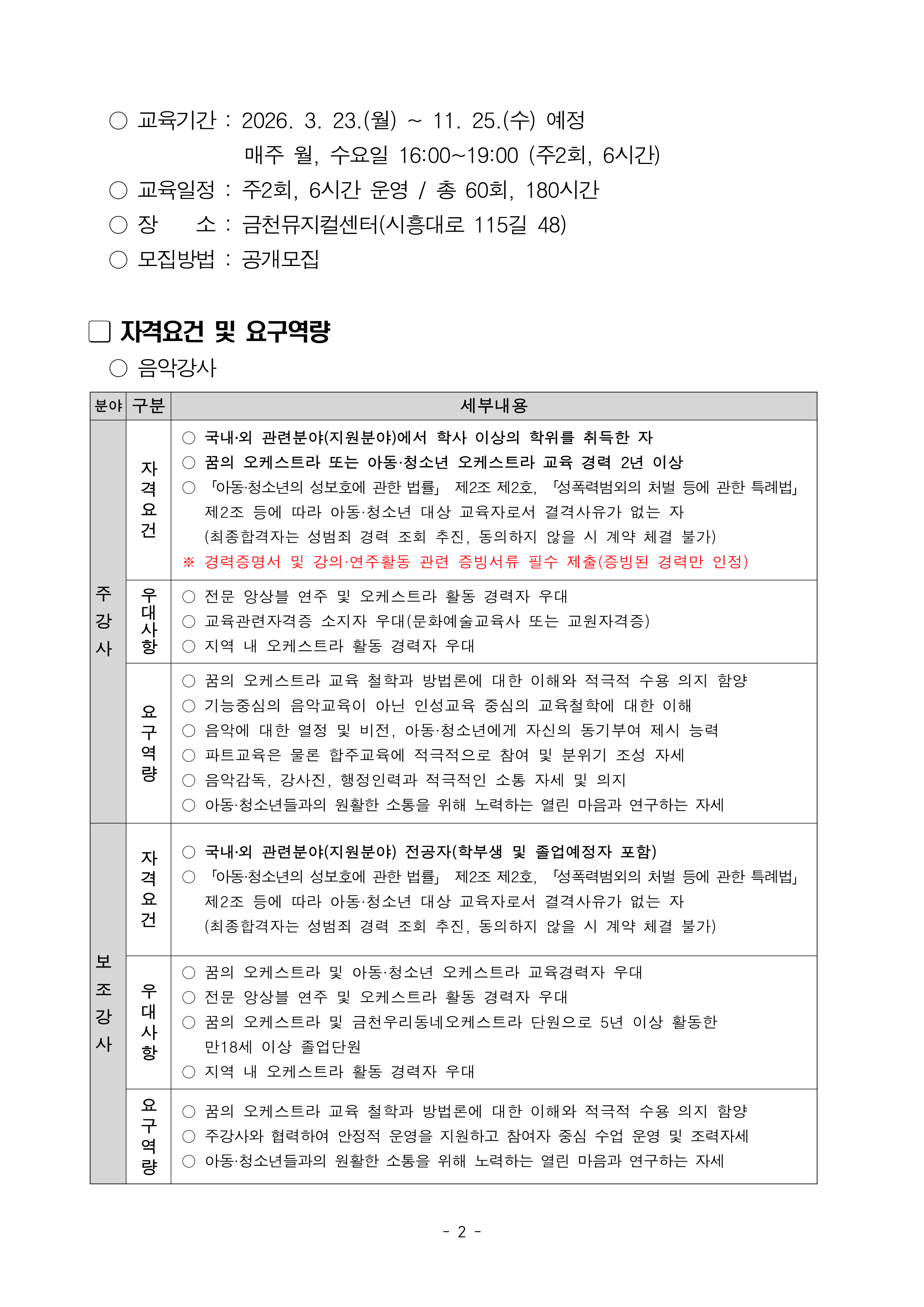 [회원등록공고] 2026 '꿈의 오케스트라 금천' 음악강사 및 코디네이터 공개 모집
