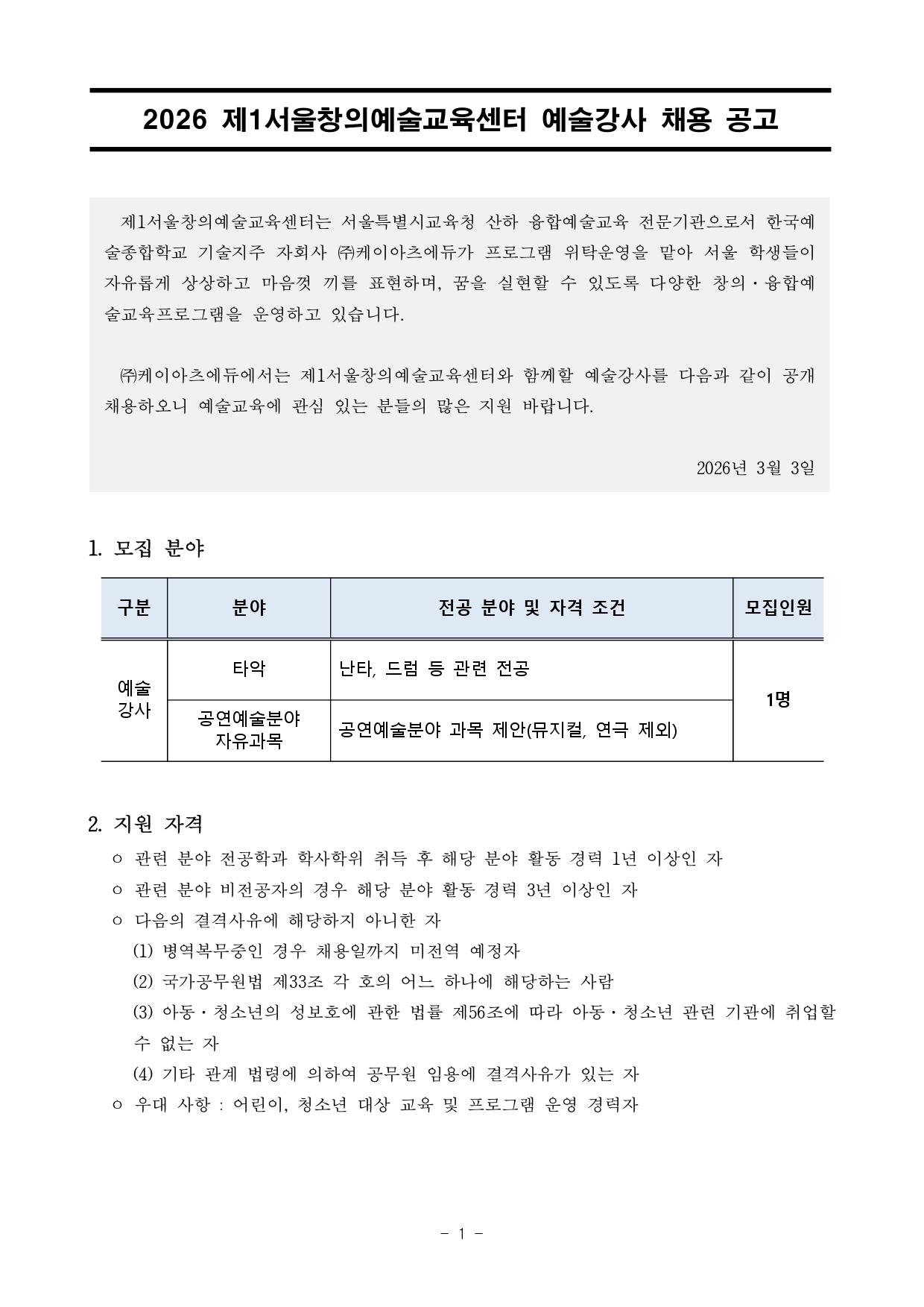 2026 제1서울창의예술교육센터 예술강사 채용 공고(타악/공연예술)(~3/4)
