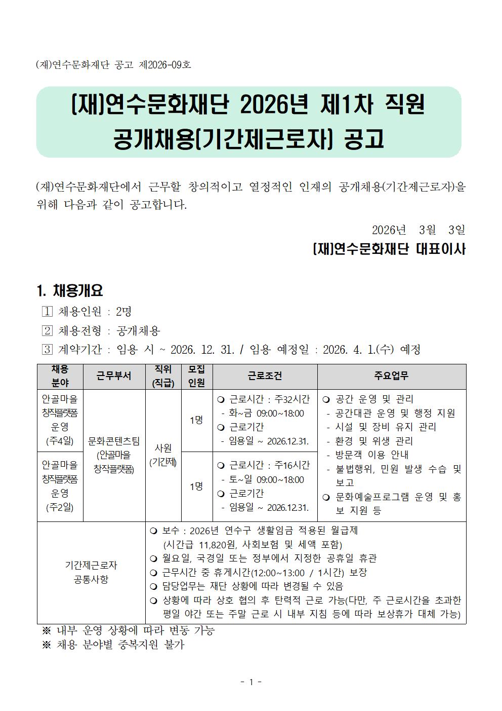 (재)연수문화재단 2026년 제1차 직원(기간제근로자) 공개채용 공고