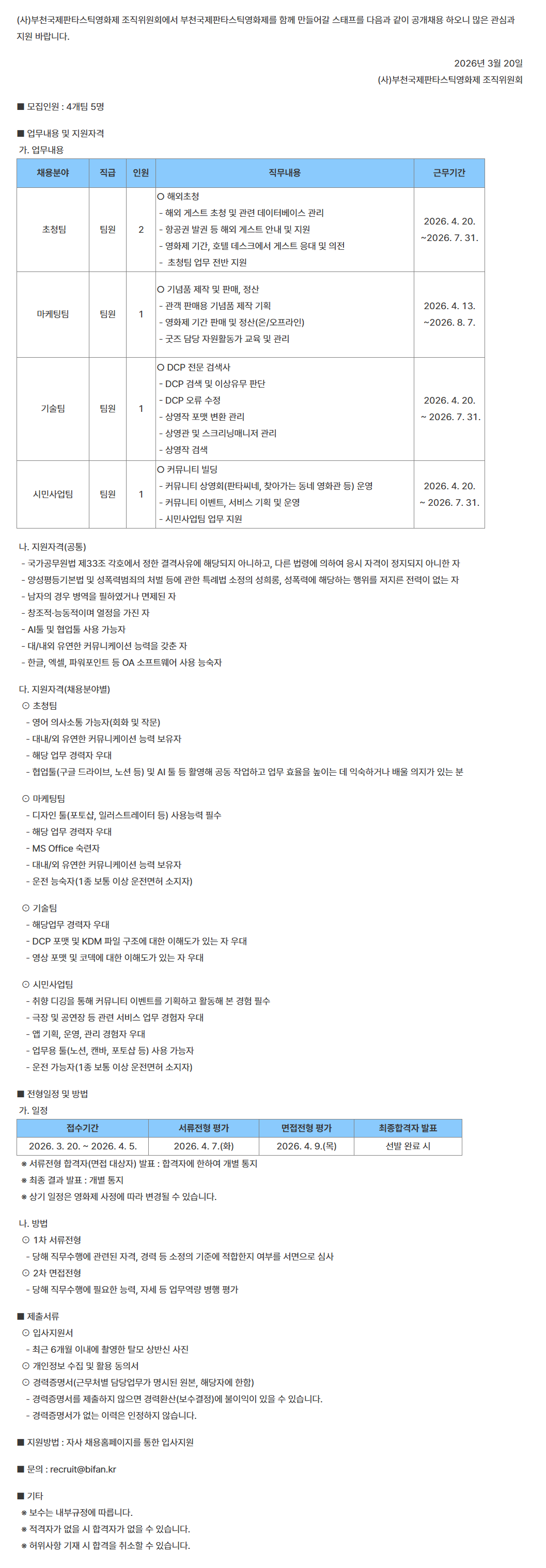 부천국제판타스틱영화제 단기 스태프 채용 5차(초청팀, 기술팀, 마케팅팀, 시민사업팀)