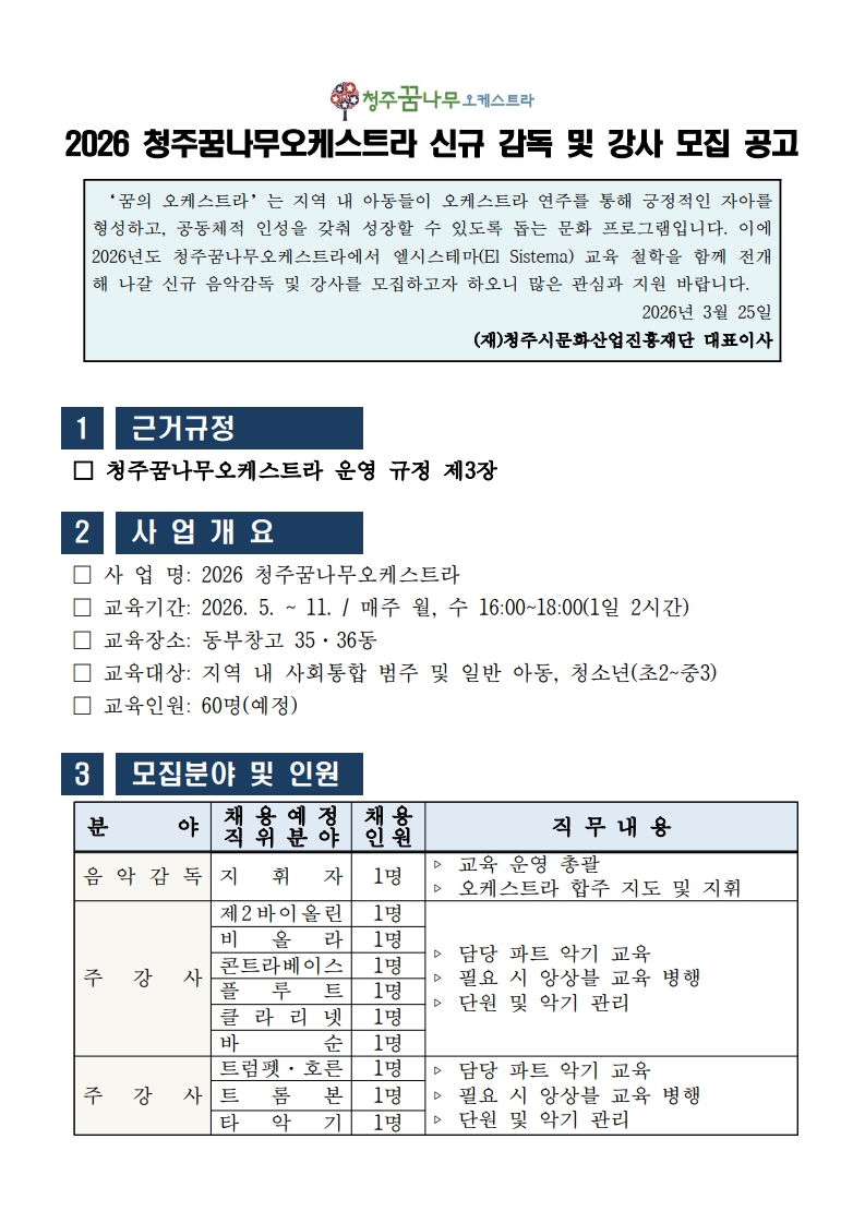 <2026 청주꿈나무오케스트라 신규 감독 및 강사 모집>