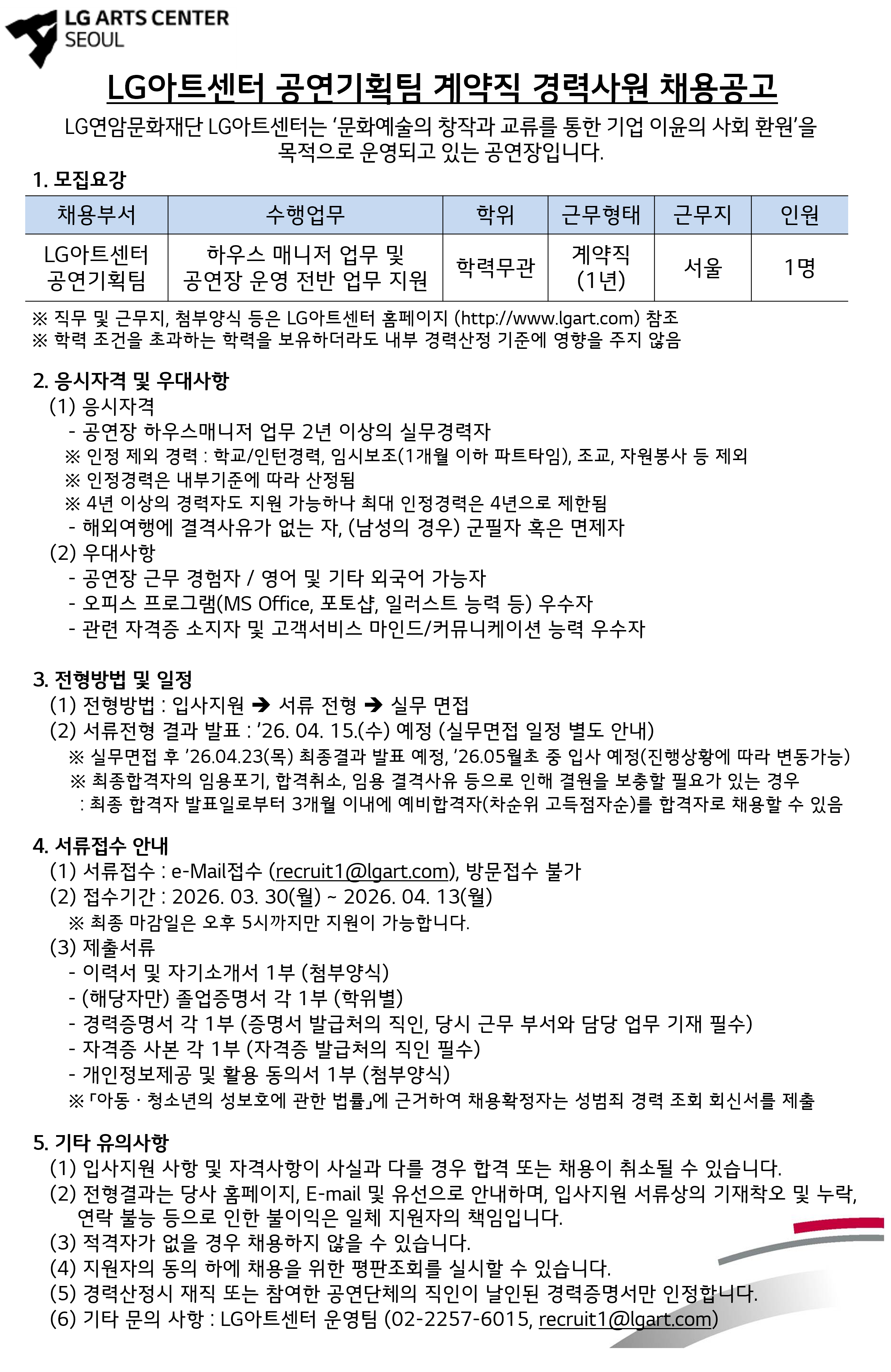 LG아트센터 공연기획팀(하우스매니저) 계약직 경력사원 채용