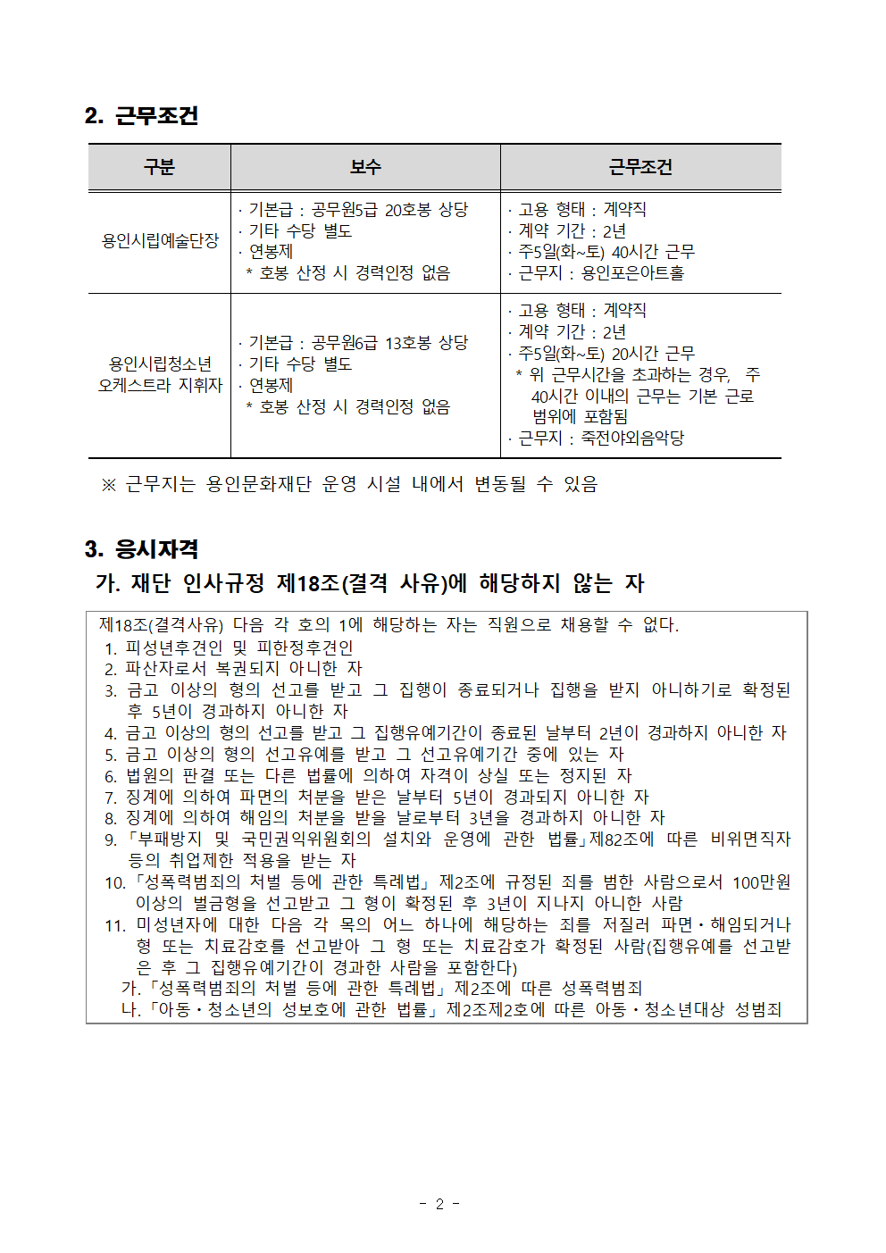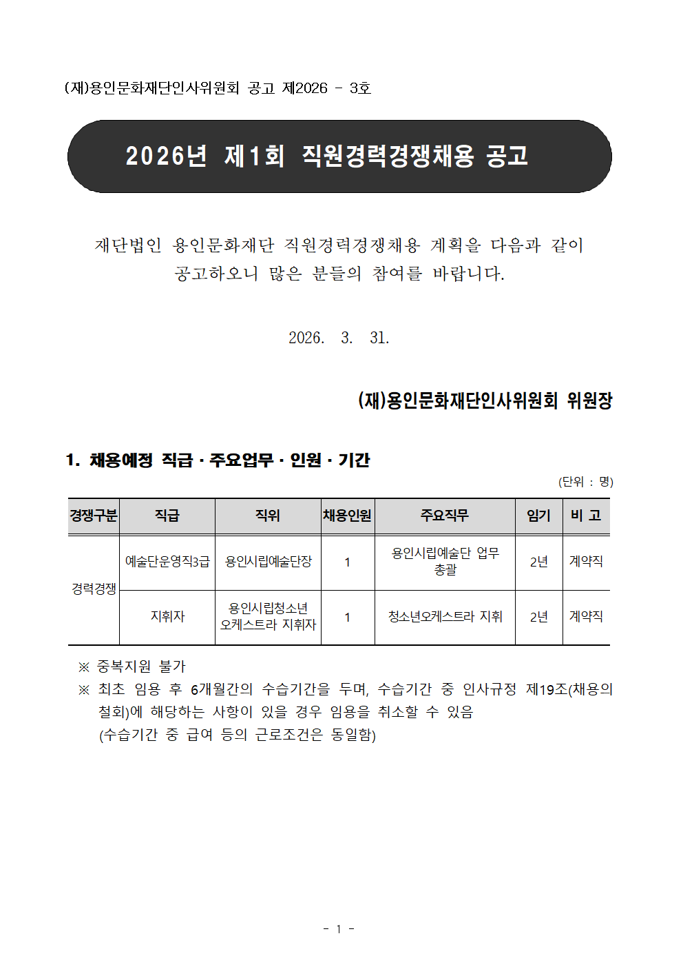 용인문화재단 2026년 제1회 직원경력경쟁채용 공고
