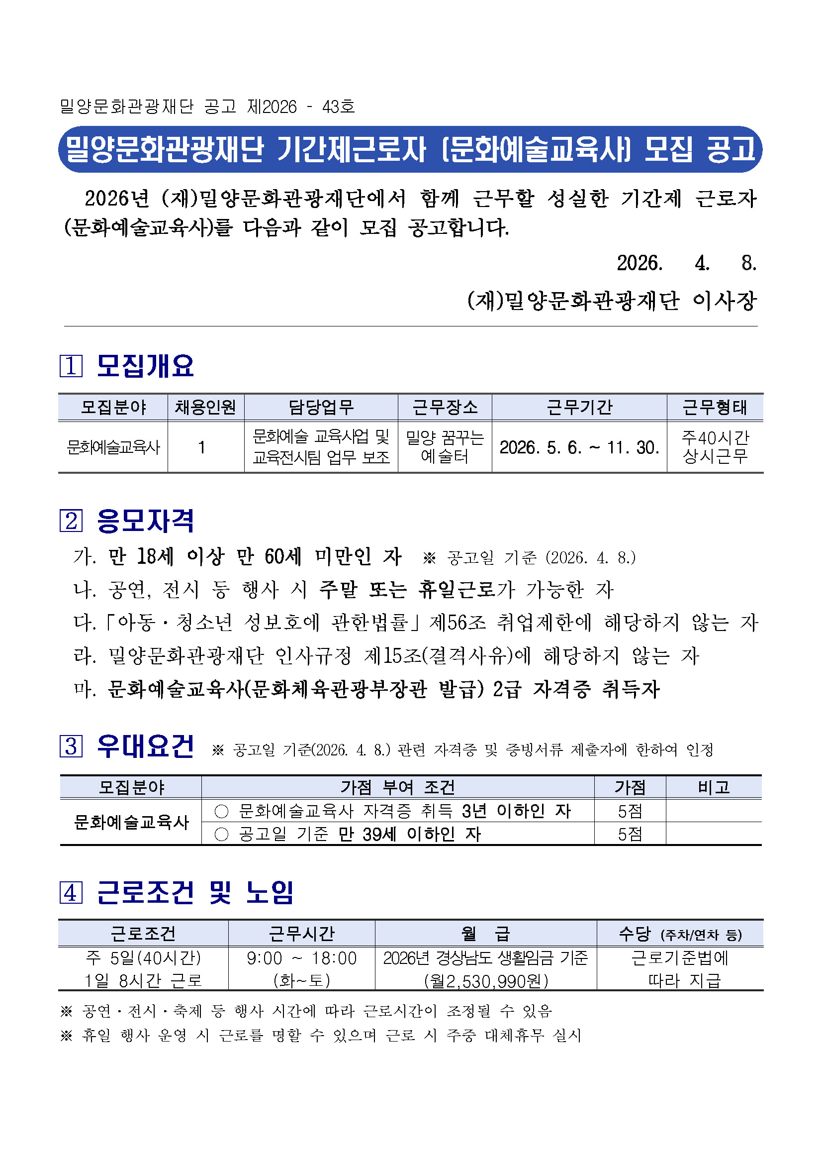 [(재)밀양문화관광재단] 2026년 기간제근로자(문화예술교육사) 공개채용 공고