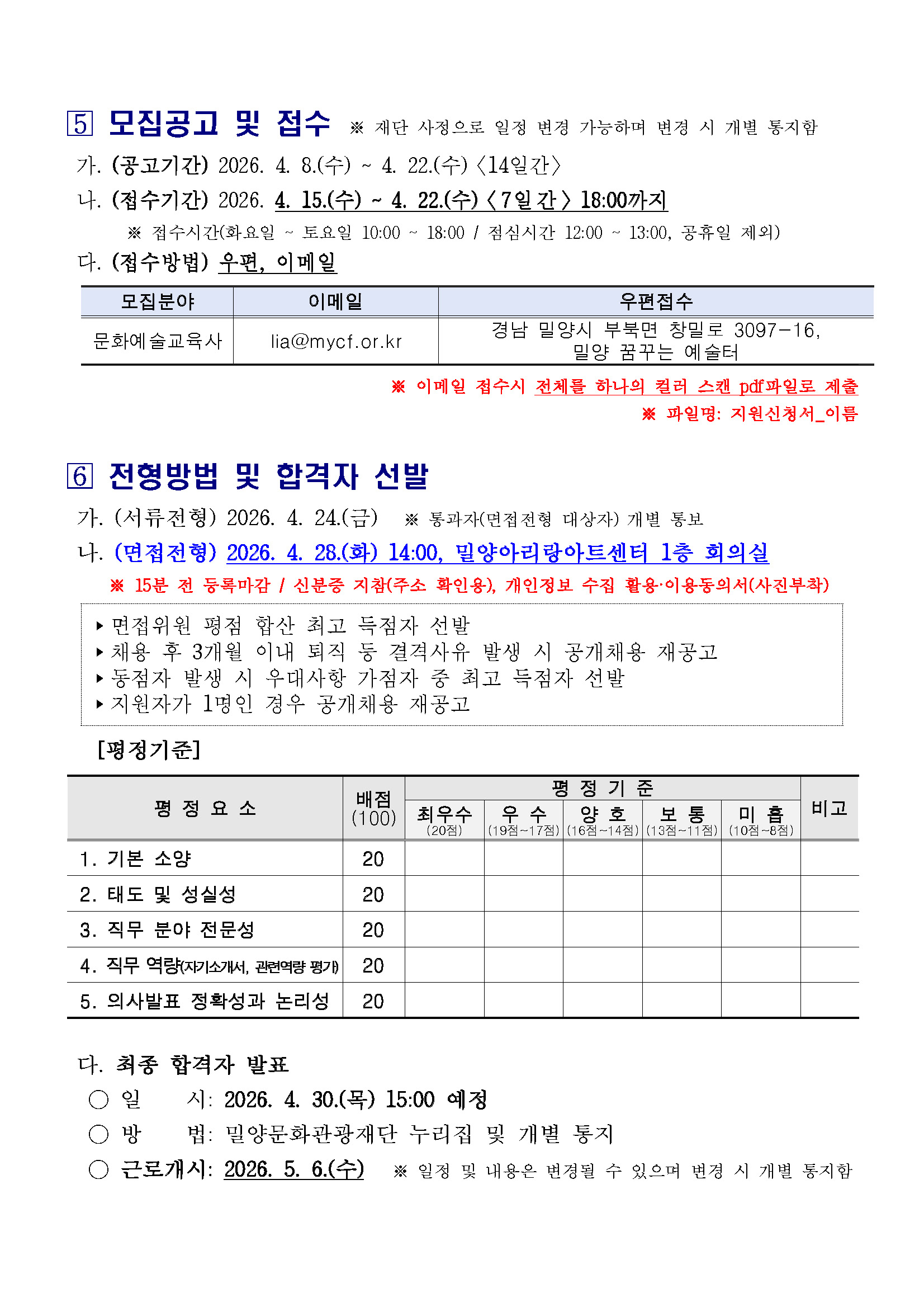 [(재)밀양문화관광재단] 2026년 기간제근로자(문화예술교육사) 공개채용 공고