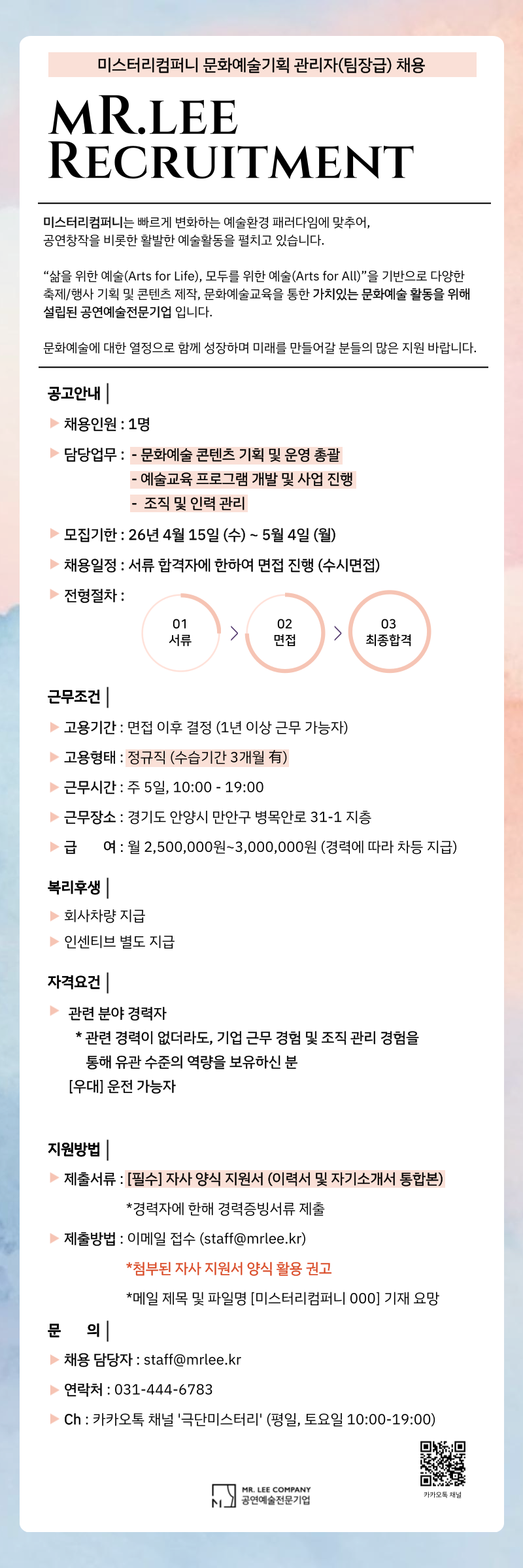 [미스터리컴퍼니] 2026 문화예술기획 관리자(팀장급) 모집