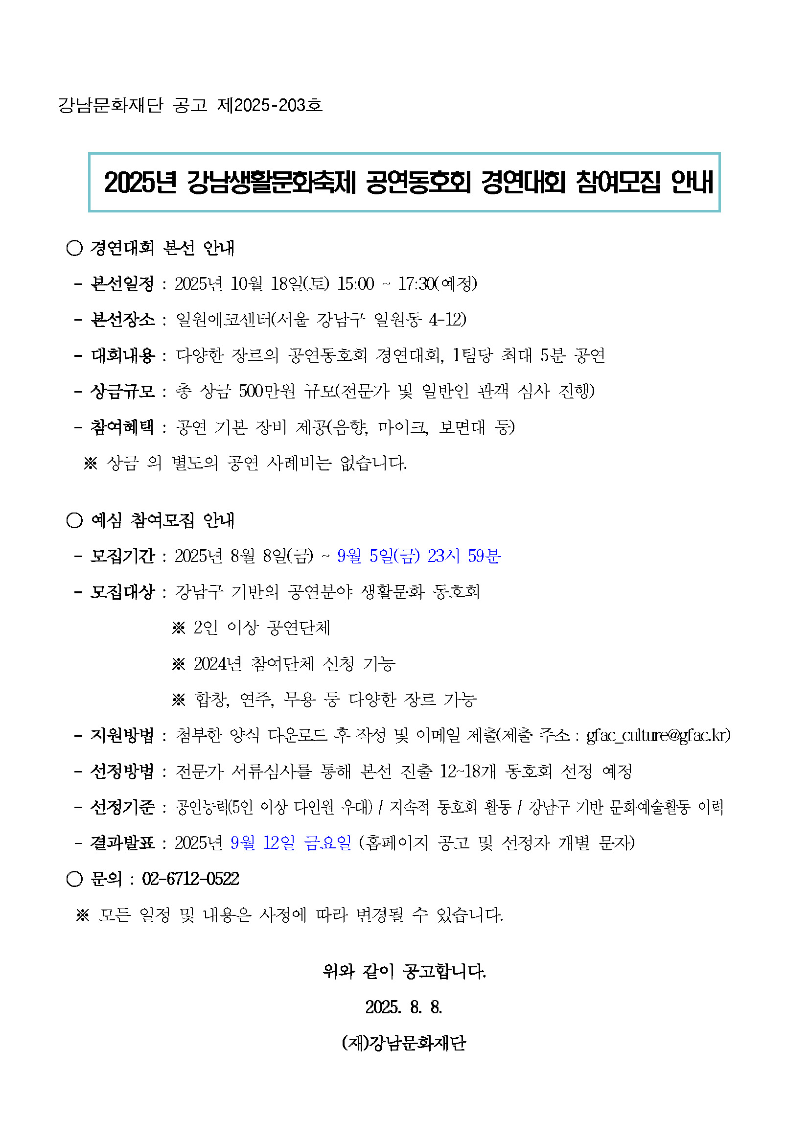 2025년 강남생활문화축제 공연동호회 경연대회 참여모집 안내 (모집기간 연장)
