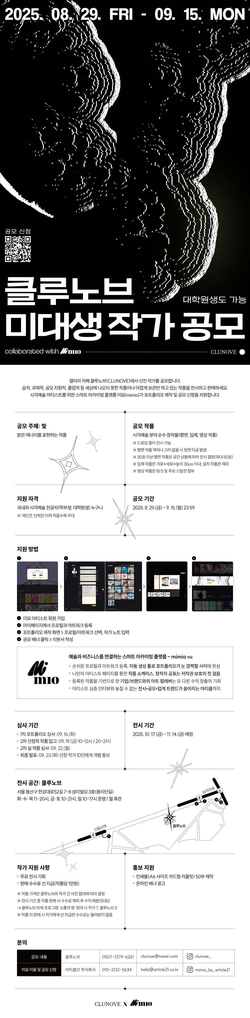 - 공모 신청 및 플랫폼 이용: 아티클21 / 010-2132-5634 / hello@article21.co.kr / @mimio_by_article21