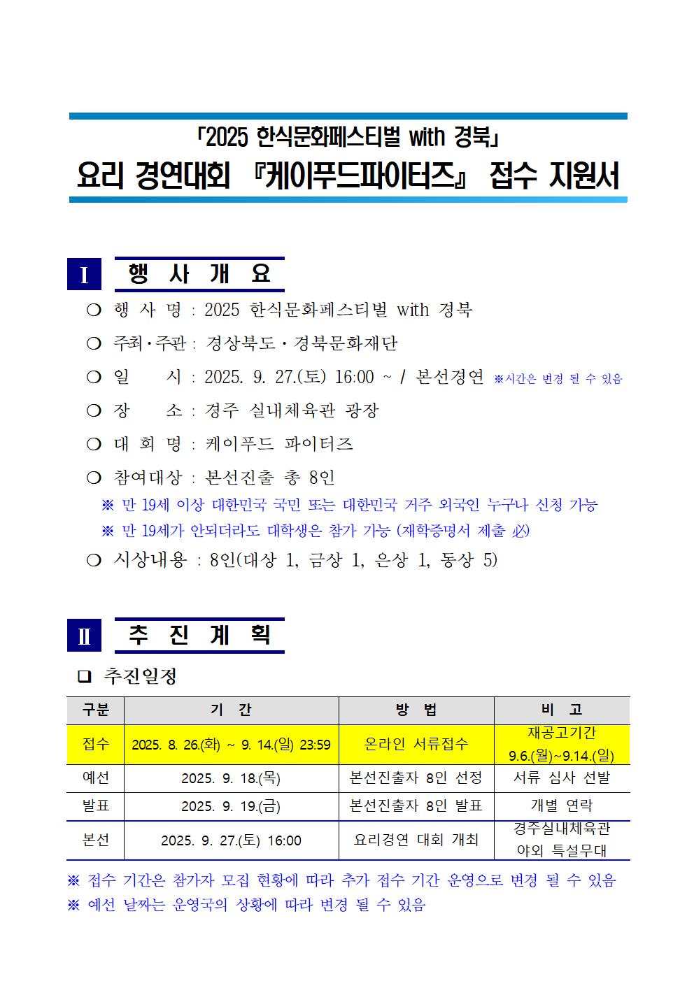 2025 한식문화페스티벌 with 경북」 요리 경연대회 『케이푸드파이터즈』 모집 공고(재)