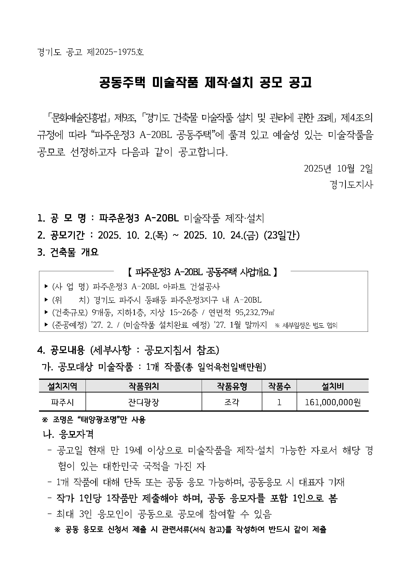 파주운정3 A-20BL 공동주택 미술작품 제작·설치 공모 공고