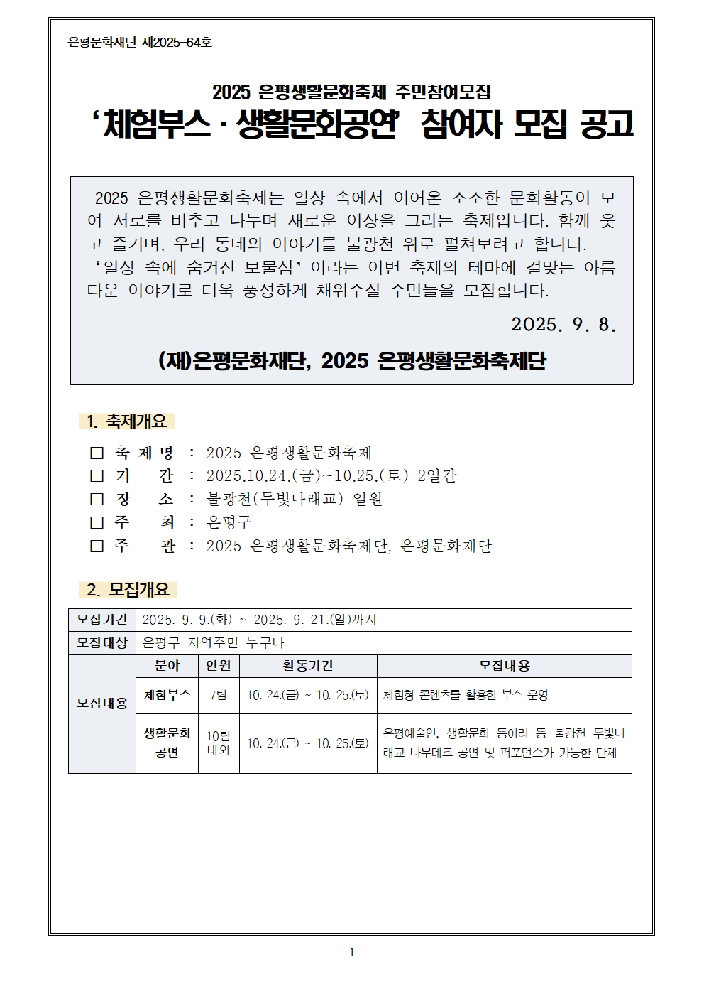 2025 은평생활문화축제 주민참여 체험부스 ·생활문화공연 참여자 모집 공고
