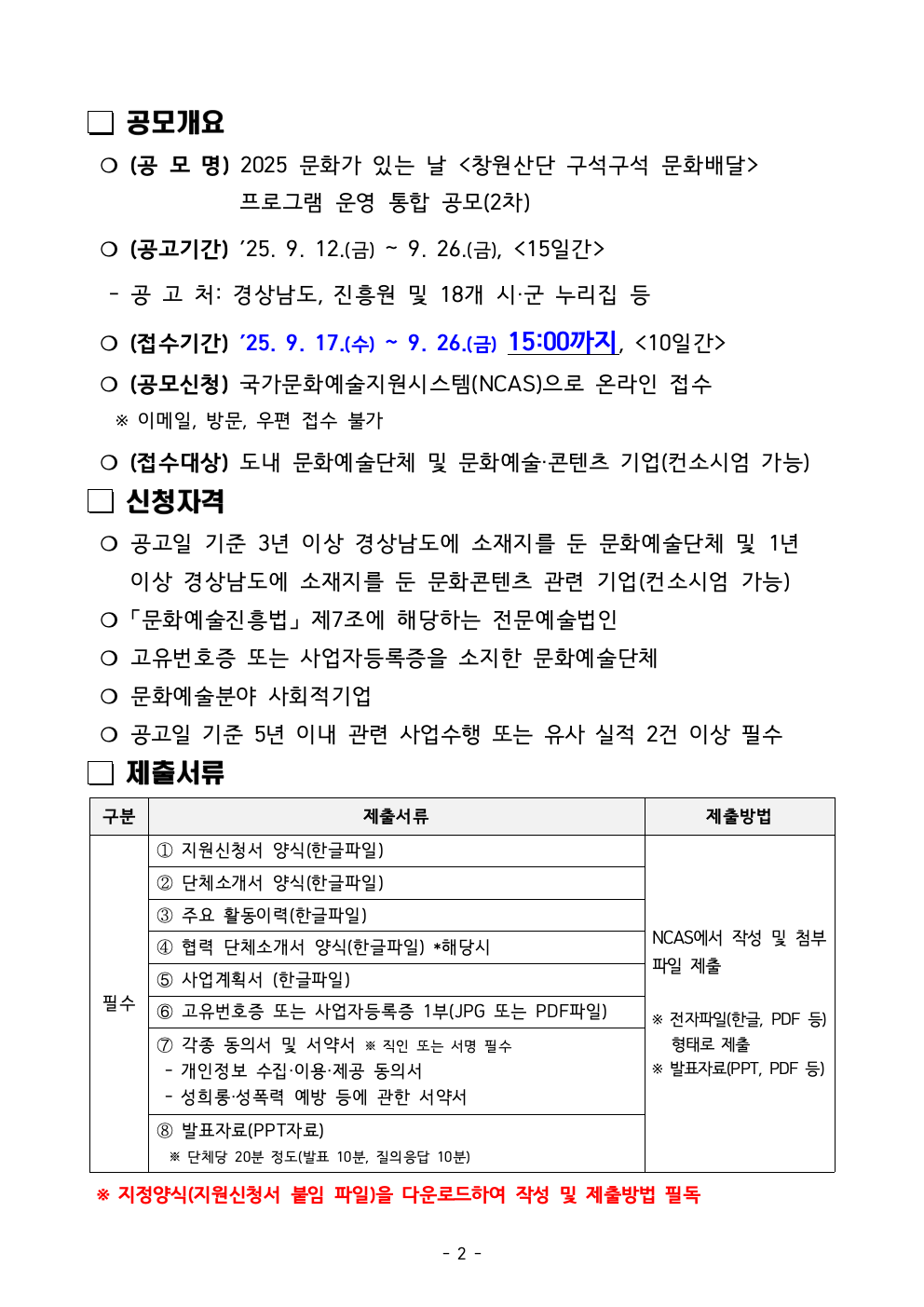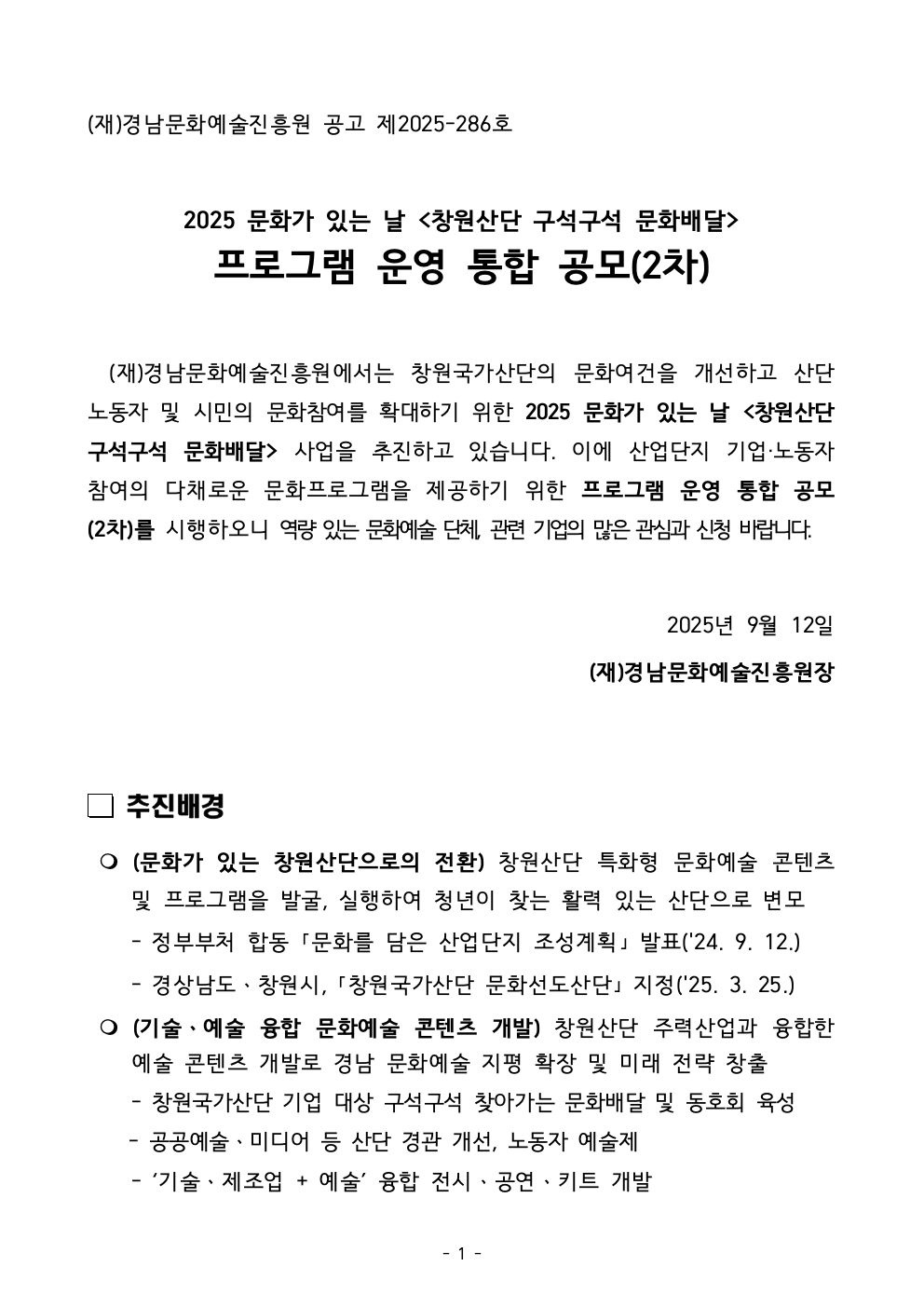2025 문화가 있는 날 창원산단 구석구석 문화배달 프로그램 운영 통합 공모(2차)