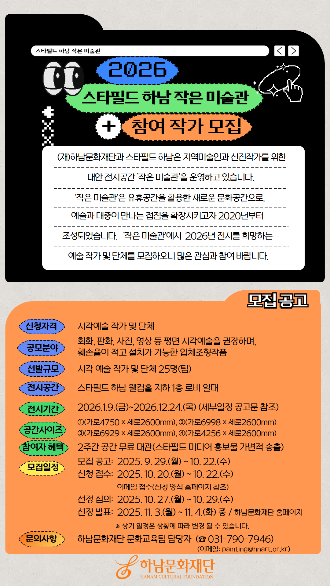 [하남문화재단] 2026년도 스타필드 하남 「작은 미술관」 참여 작가 모집 (접수: 10.20.~10.22.)