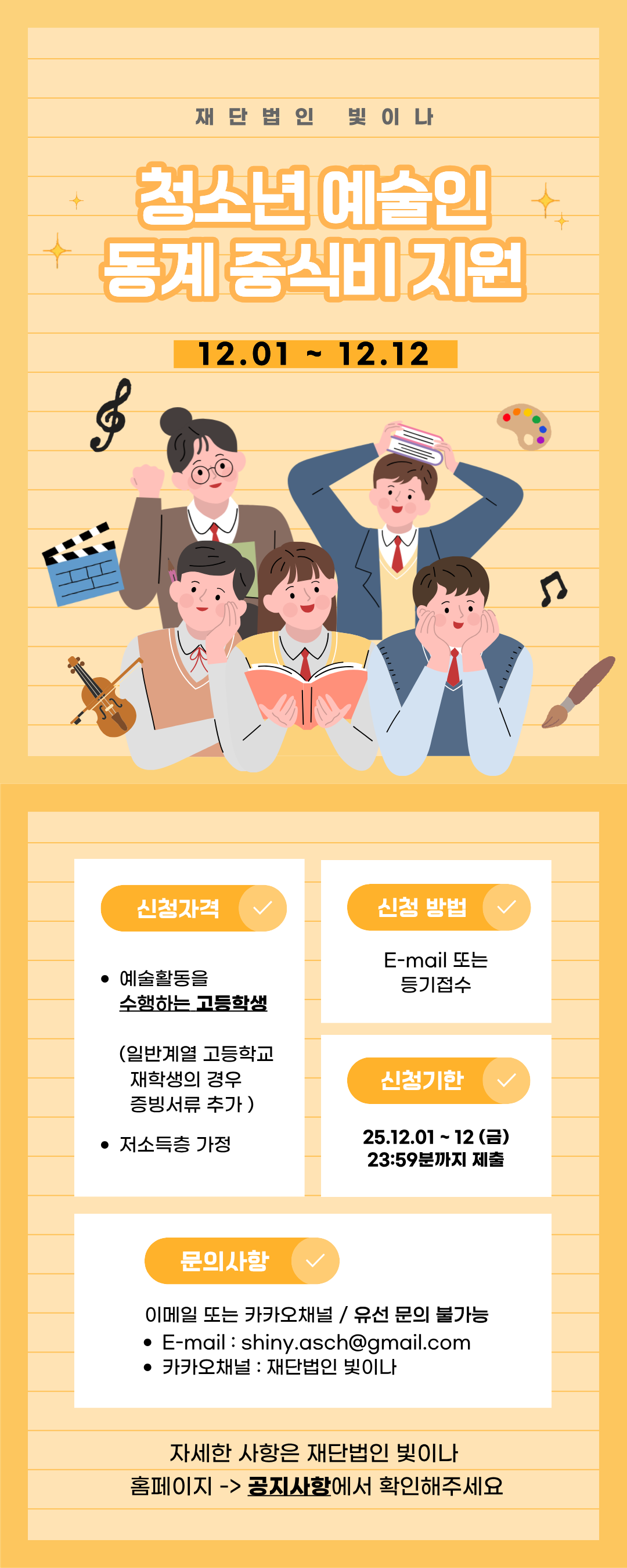 [회원등록공고] [재단법인 빛이나] 청소년 예술인 동계 중식비 지원 (일반/예술계열 고등학교)