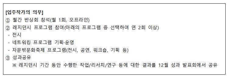 - 국내 타 공간지원/레지던시 프로그램의 입주 기간이 2026 자문밖아트레지던시 입주 기간과 중복되지