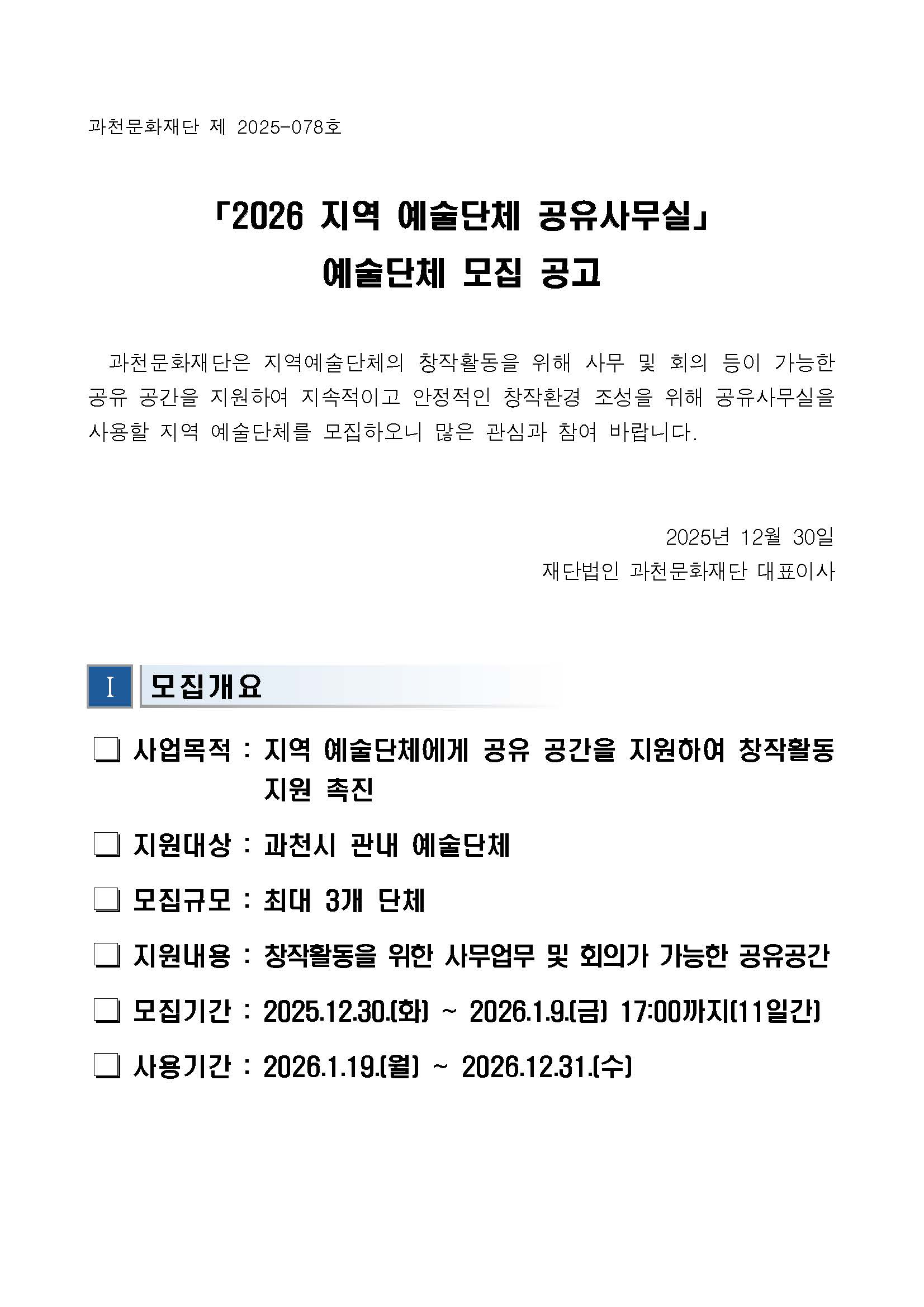 [2026 지역 예술단체 공유사무실] 예술단체 모집 공고