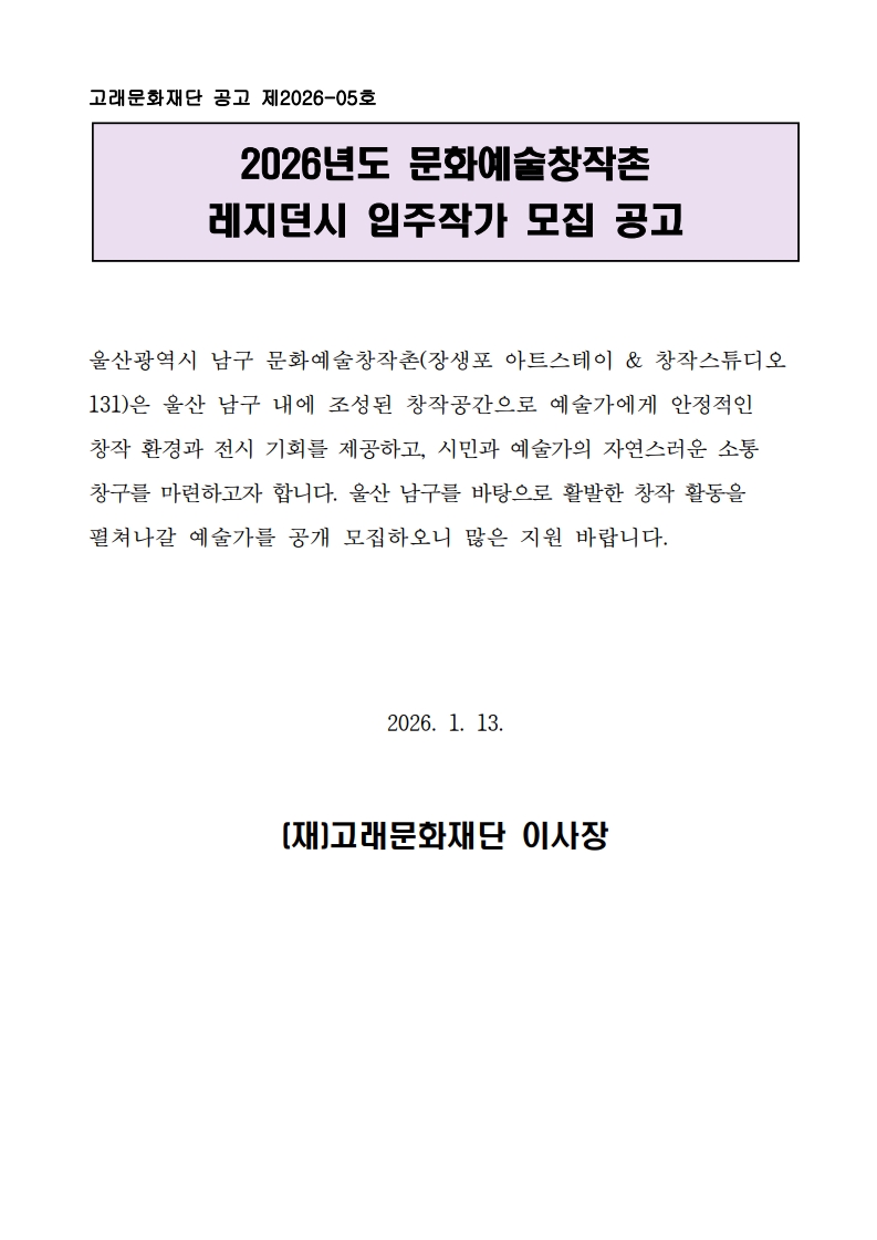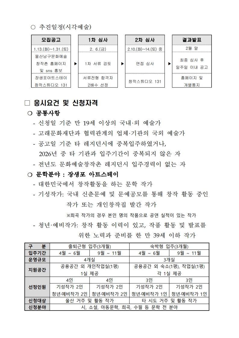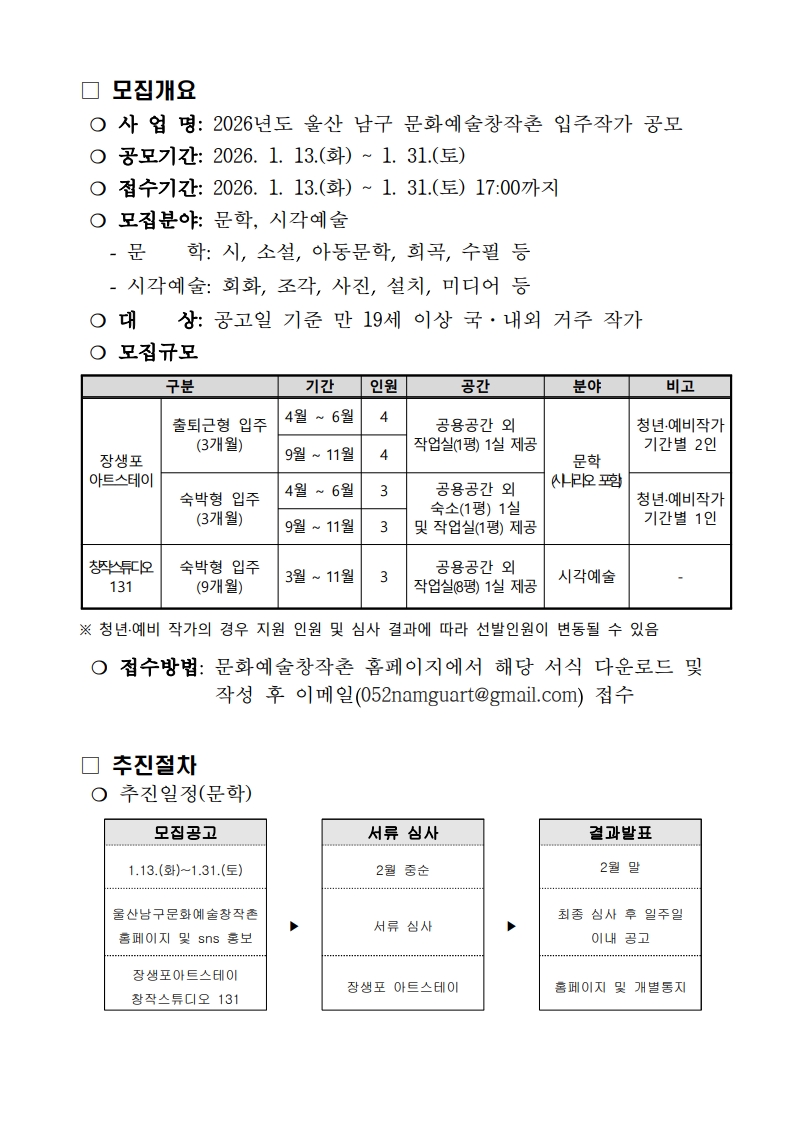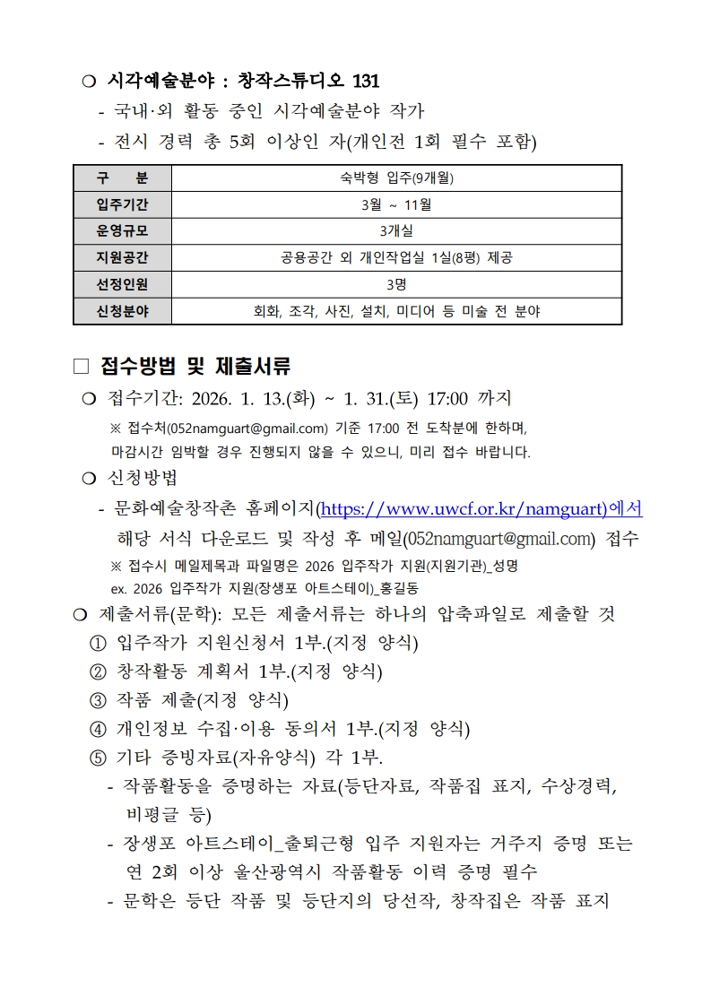 2026년도 울산 남구 문화예술창작촌 레지던시 입주작가 모집 - 문학, 시각예술