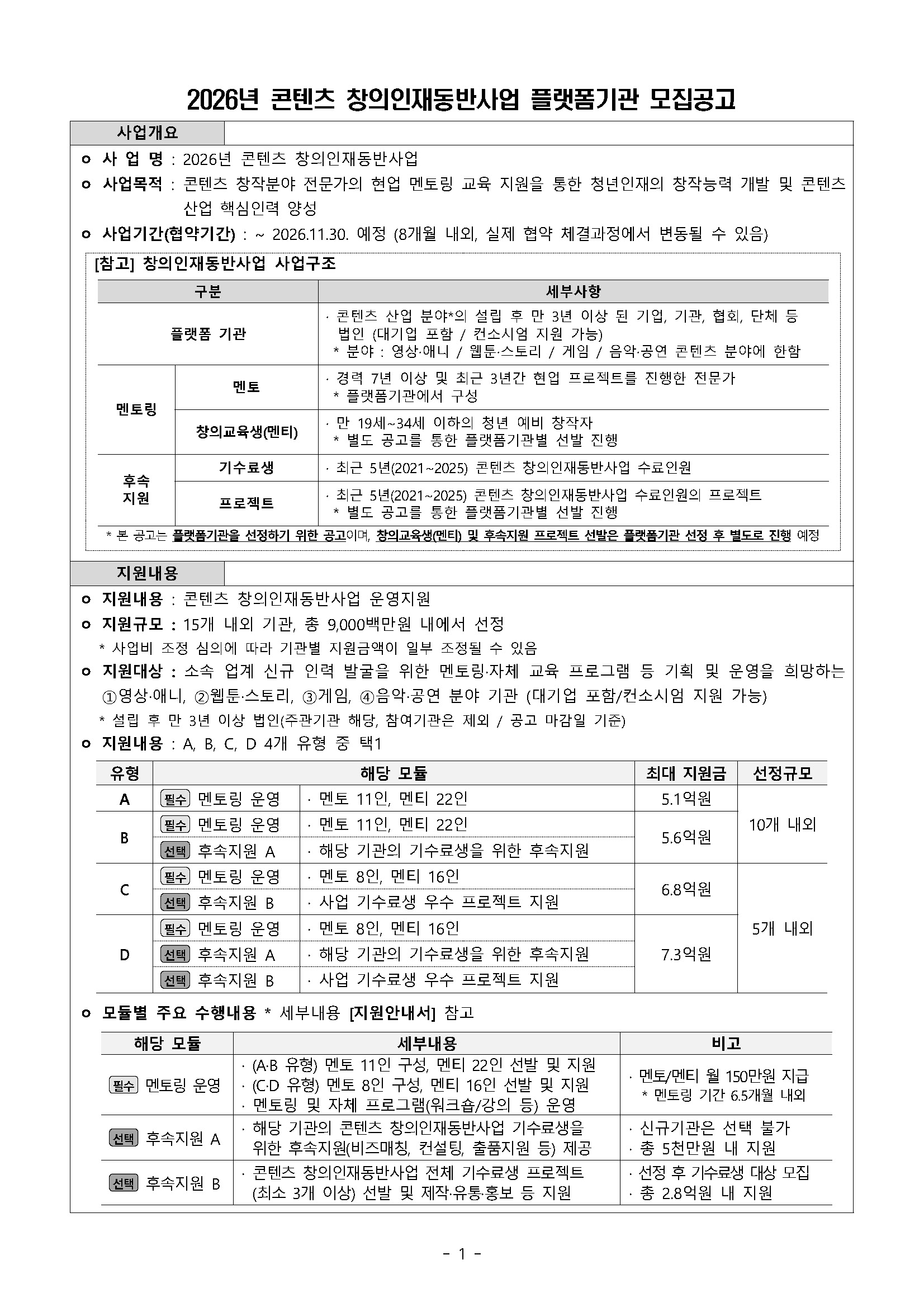 2026년 콘텐츠 창의인재동반사업 플랫폼기관 모집공고