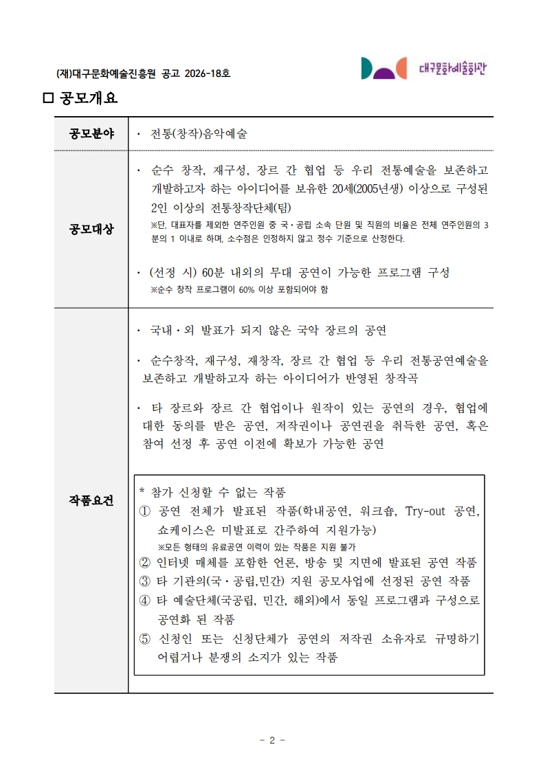 2026 대구문화예술회관 국악인 인큐베이팅 사업 참여단체 공고