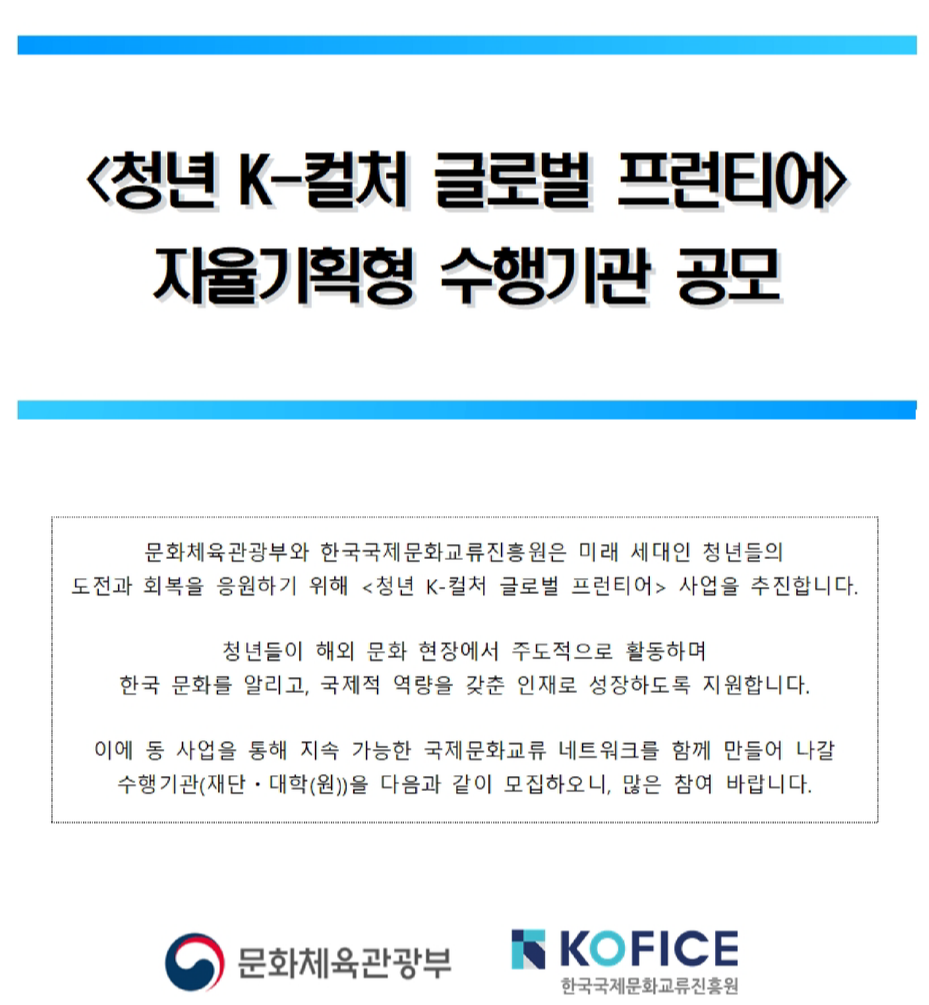 <2026 청년 K-컬처 글로벌 프런티어> 자율기획형 수행기관 공모