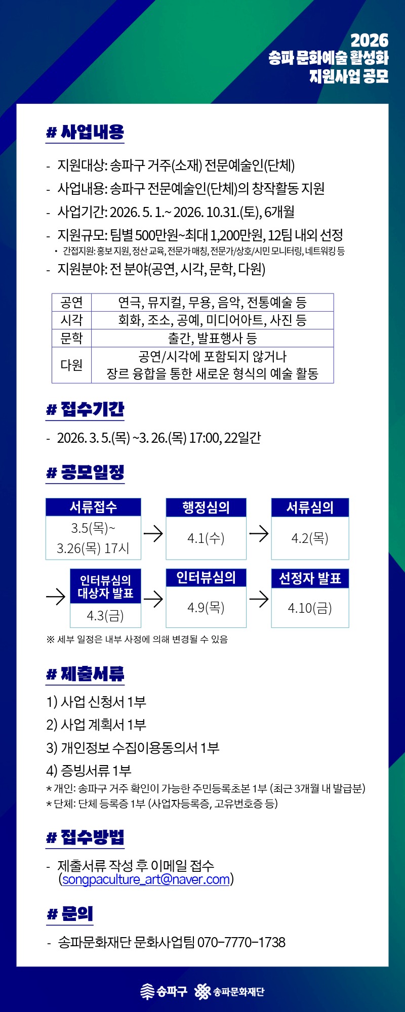 ■ 접수방법 : 송파문화재단 홈페이지에서 공고문 서류작성 후 이메일 제출