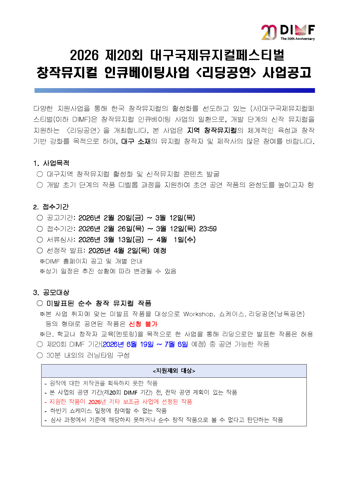 2026 DIMF 뮤지컬 인큐베이팅사업 리딩공연 공고