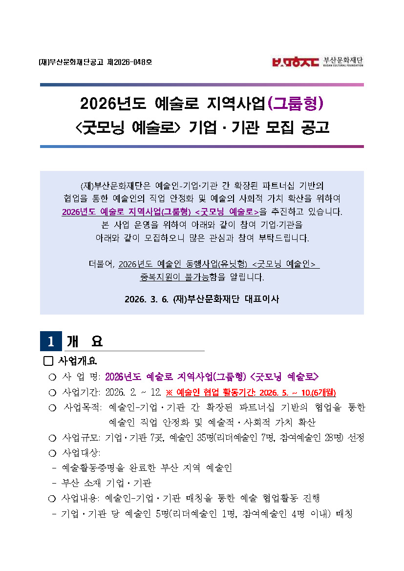 2026 예술로 지역사업(그룹형) <굿모닝 예술로> 참여 기업·기관 모집 (前예술인파견지원사업-협력형)