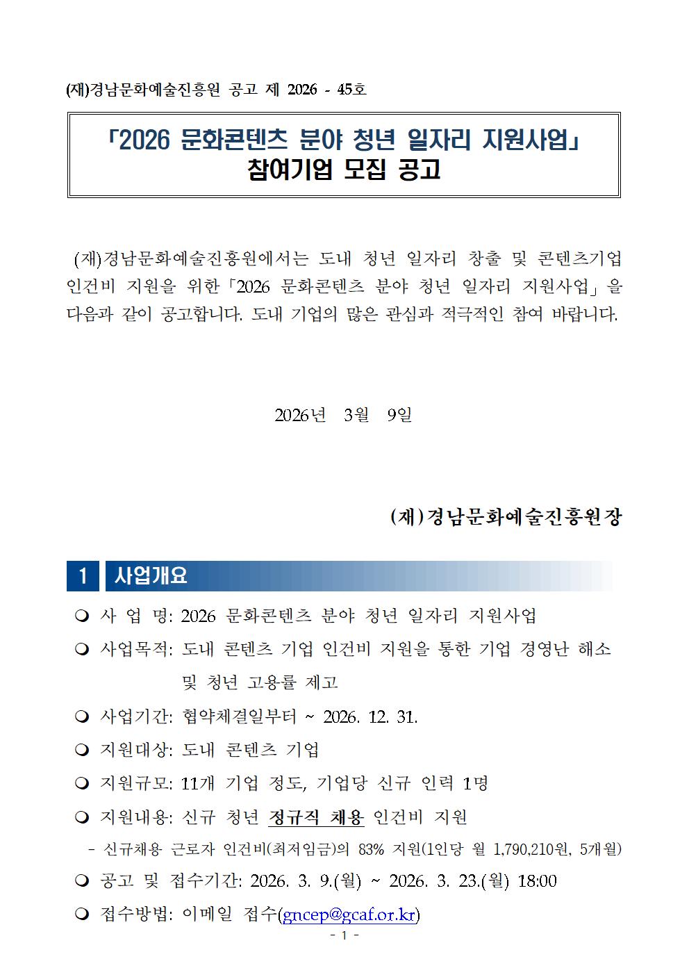 20260309042517_[붙임1] 2026 문화콘텐츠분야 청년 일자리 지원사업 참여기업 모집 공고.hwp