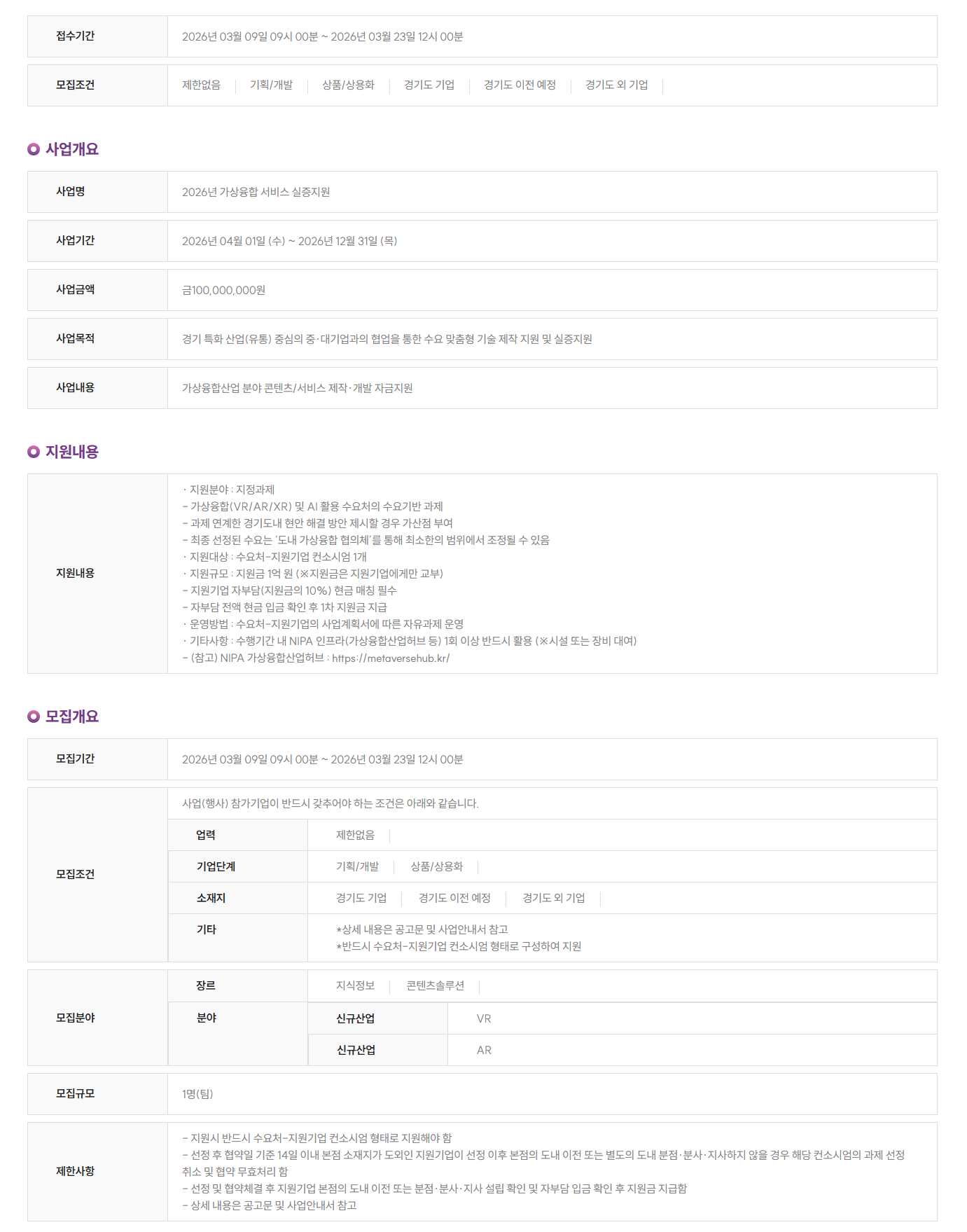2026년 가상융합 서비스 실증지원 지원기업 모집 (지정과제)