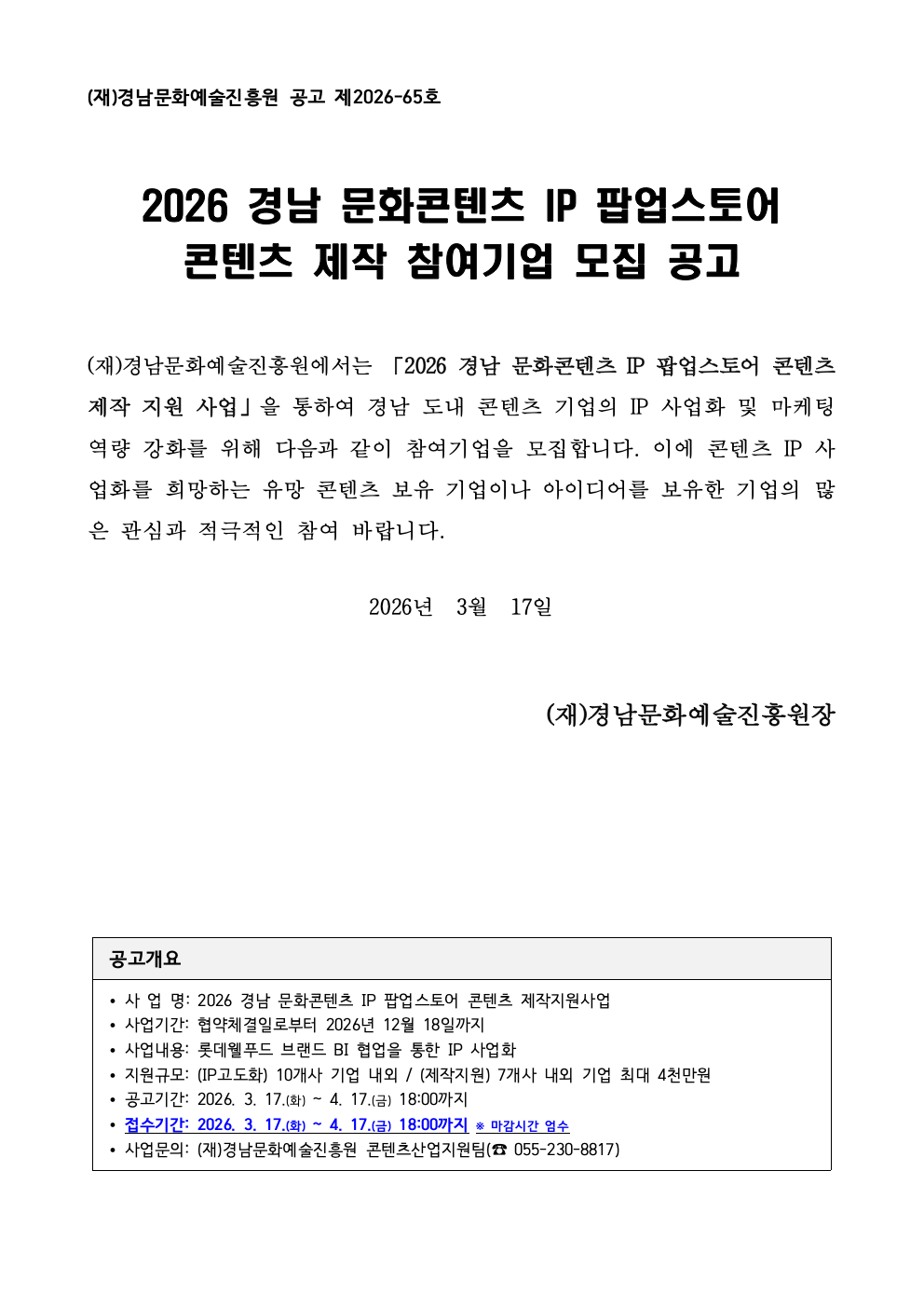 2026 경남 문화콘텐츠 IP 팝업스토어 콘텐츠 제작 참여기업 모집 공고