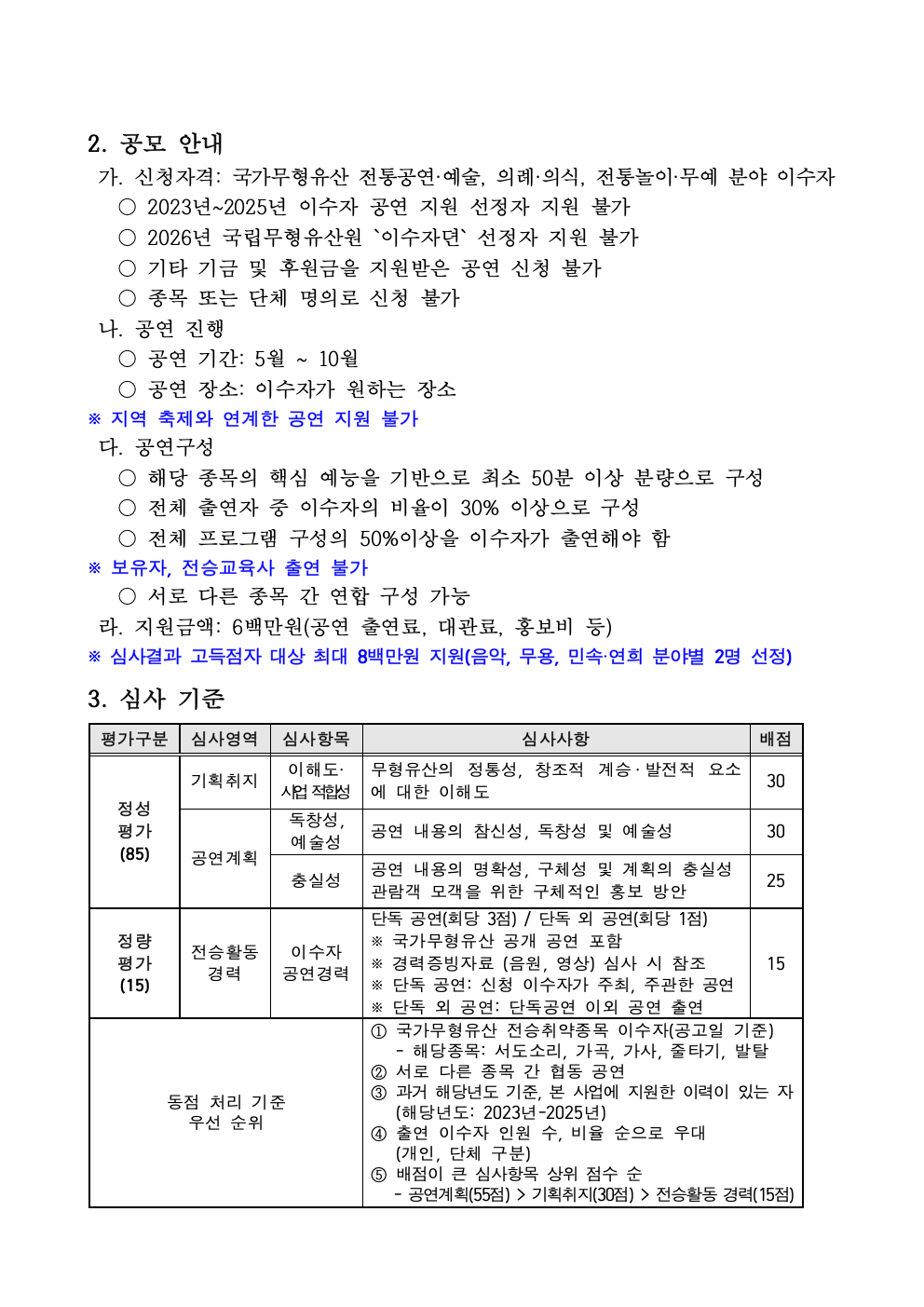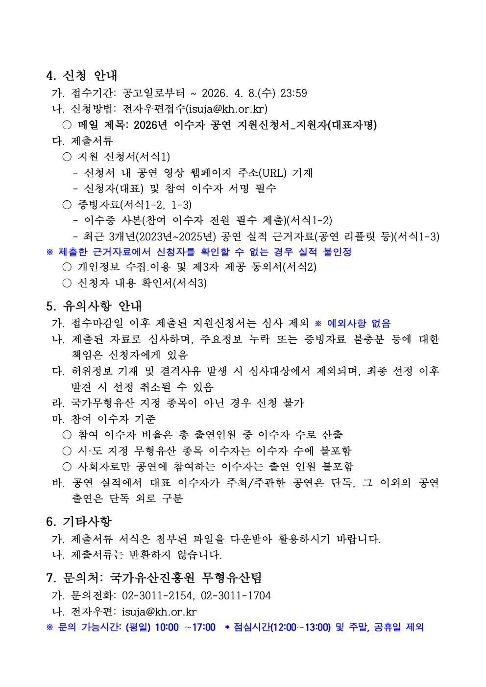 20260321112656_0. 2026년 국가무형유산 이수자 지원 사업 공연 지원 공모 안내문.hwp