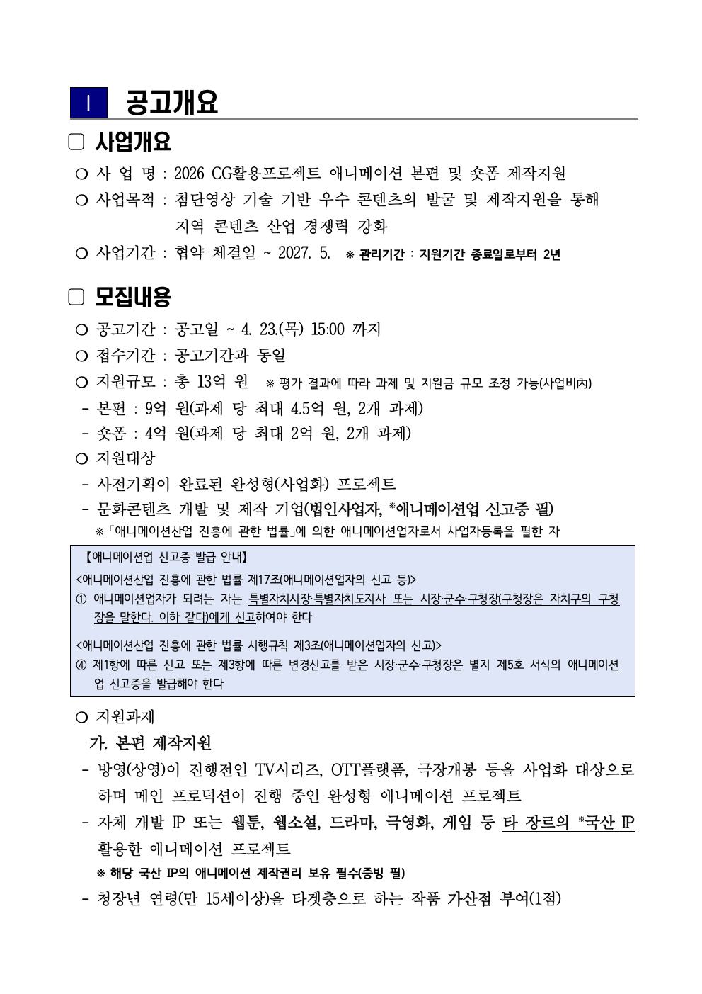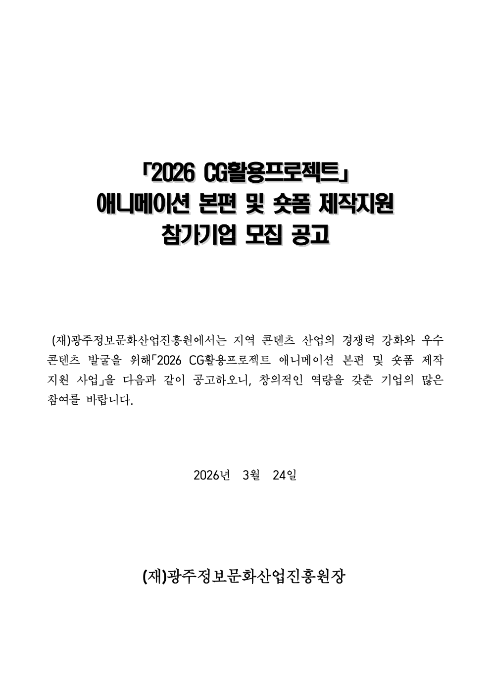 「2026 CG활용프로젝트」애니메이션 본편 및 숏폼 제작지원 참가기업 모집 공고