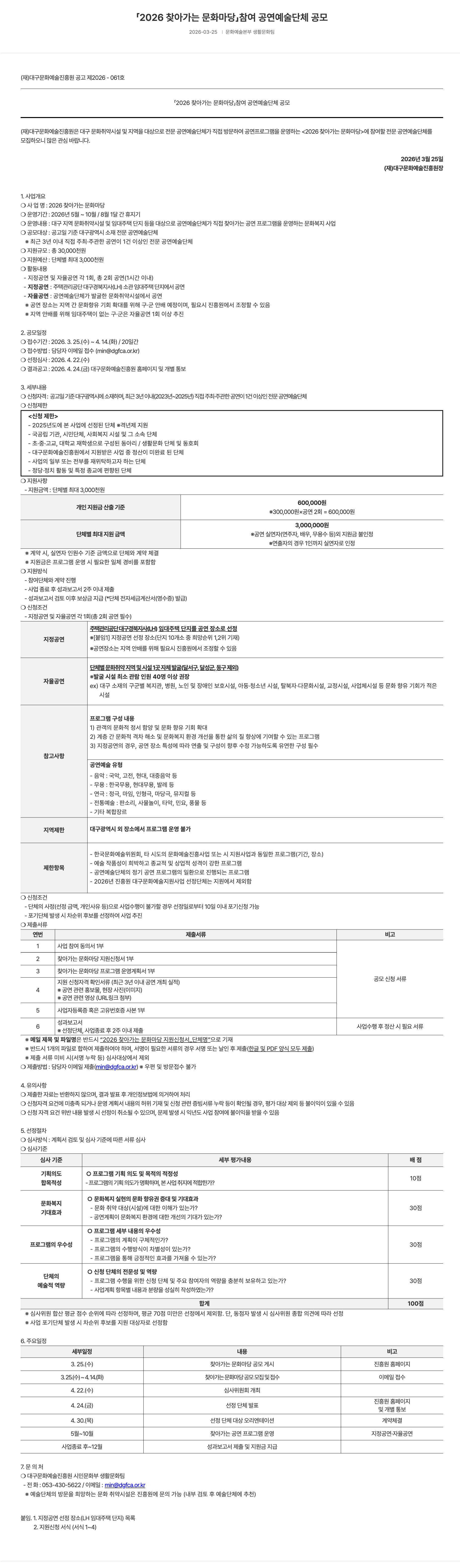 2026년 대구문화예술진흥원 K-Art 청년창작자 지원사업 공모