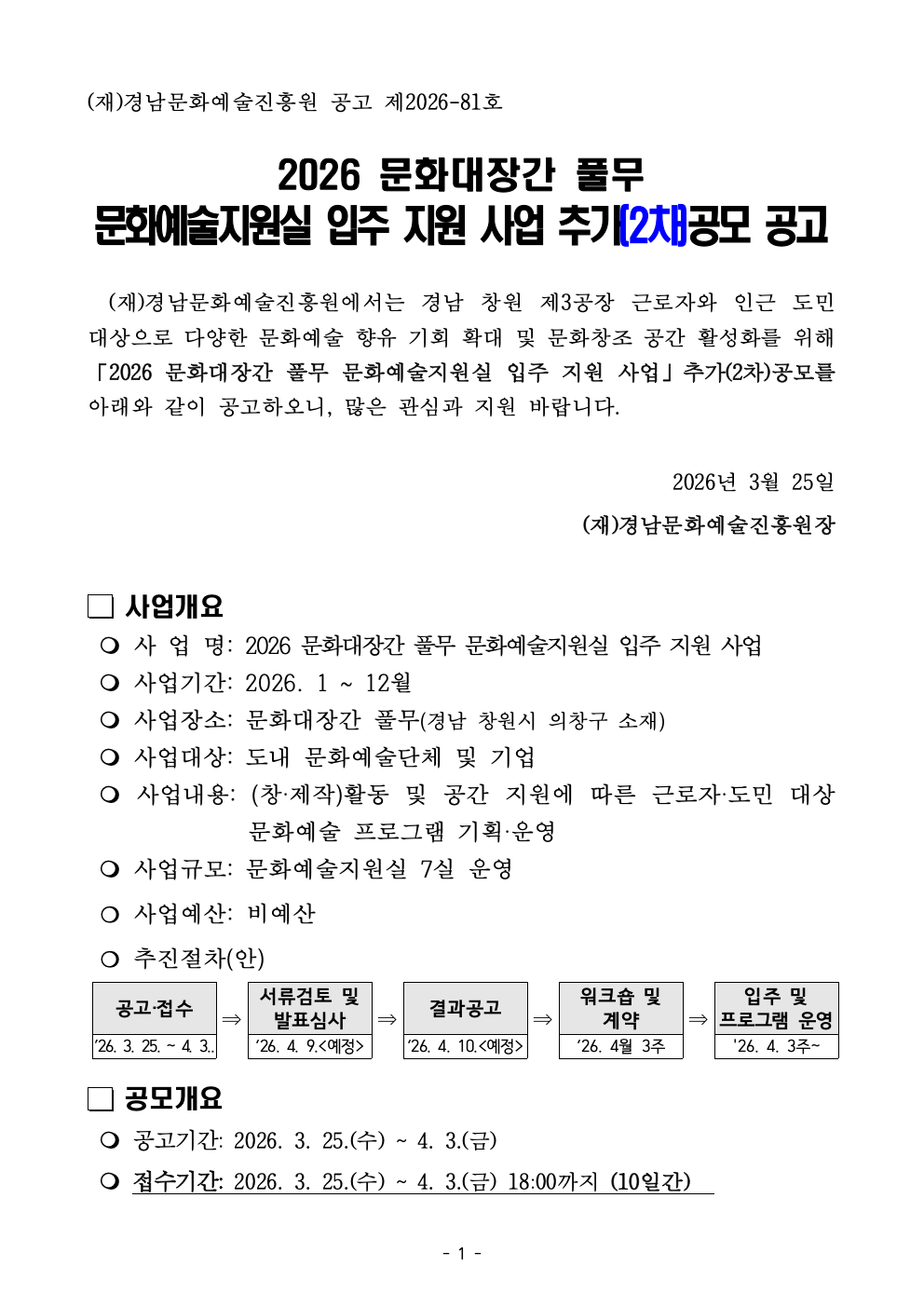 2026 문화대장간 풀무 문화예술지원실 입주 지원 사업 추가(2차)공모 공고