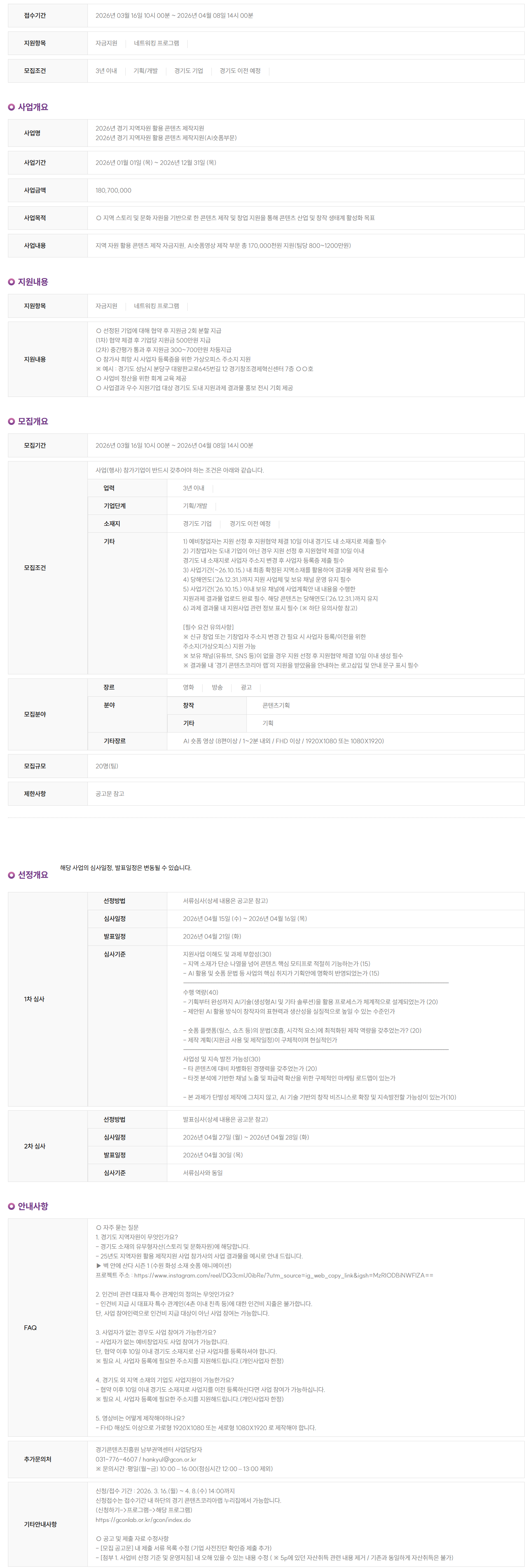 2026년 경기 지역자원 활용 콘텐츠 제작지원 지원기업(AI숏폼부문) 모집 공고(~4.8. / 3.26. 영상 비율 상세 수정)