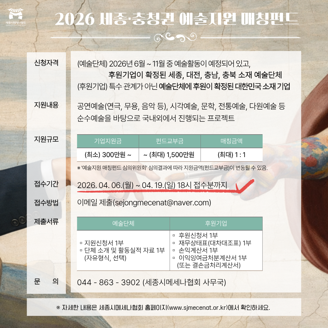 「2026 세종·충청권 예술지원 매칭펀드」 사업 공고( ~ 4/19까지)