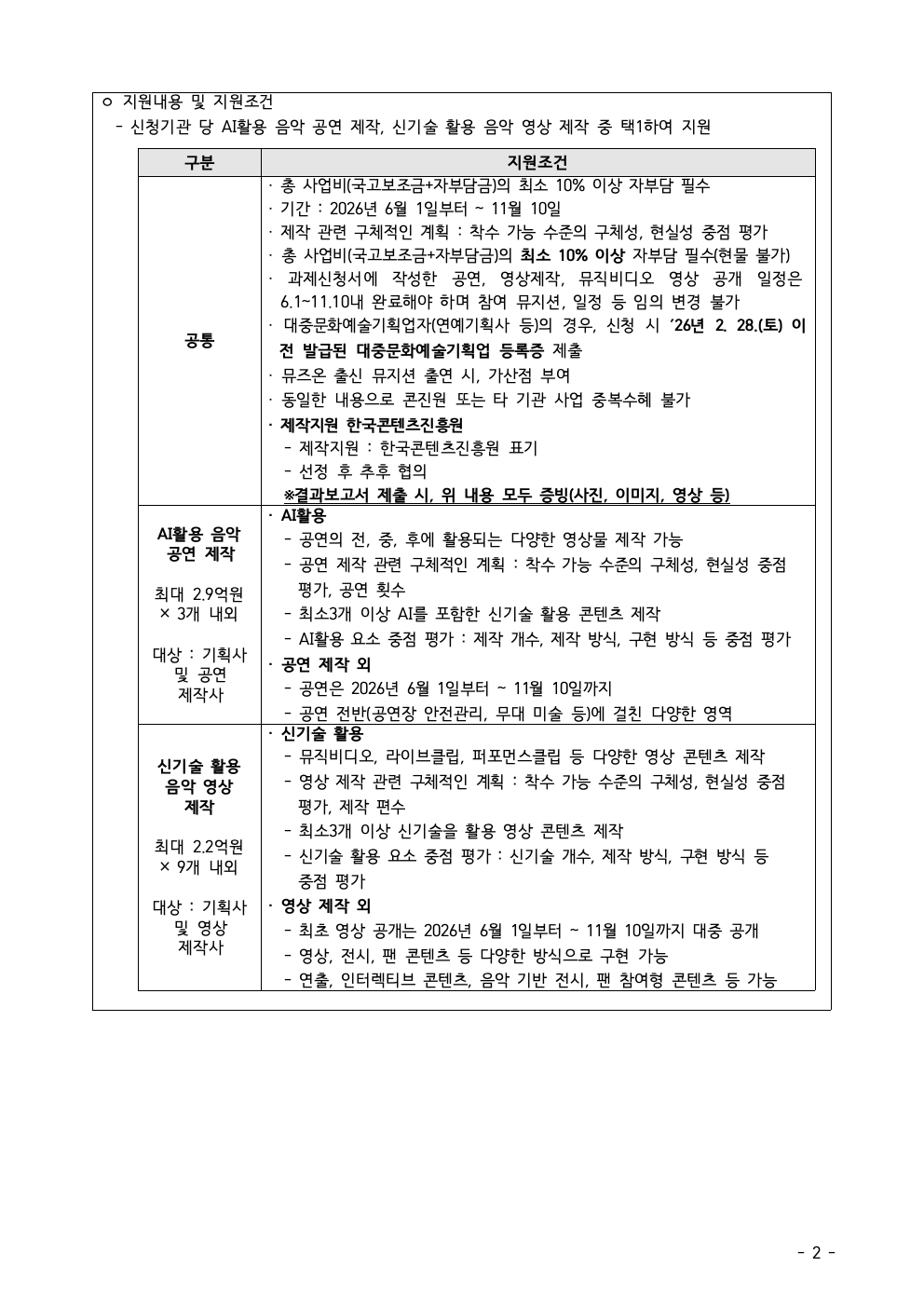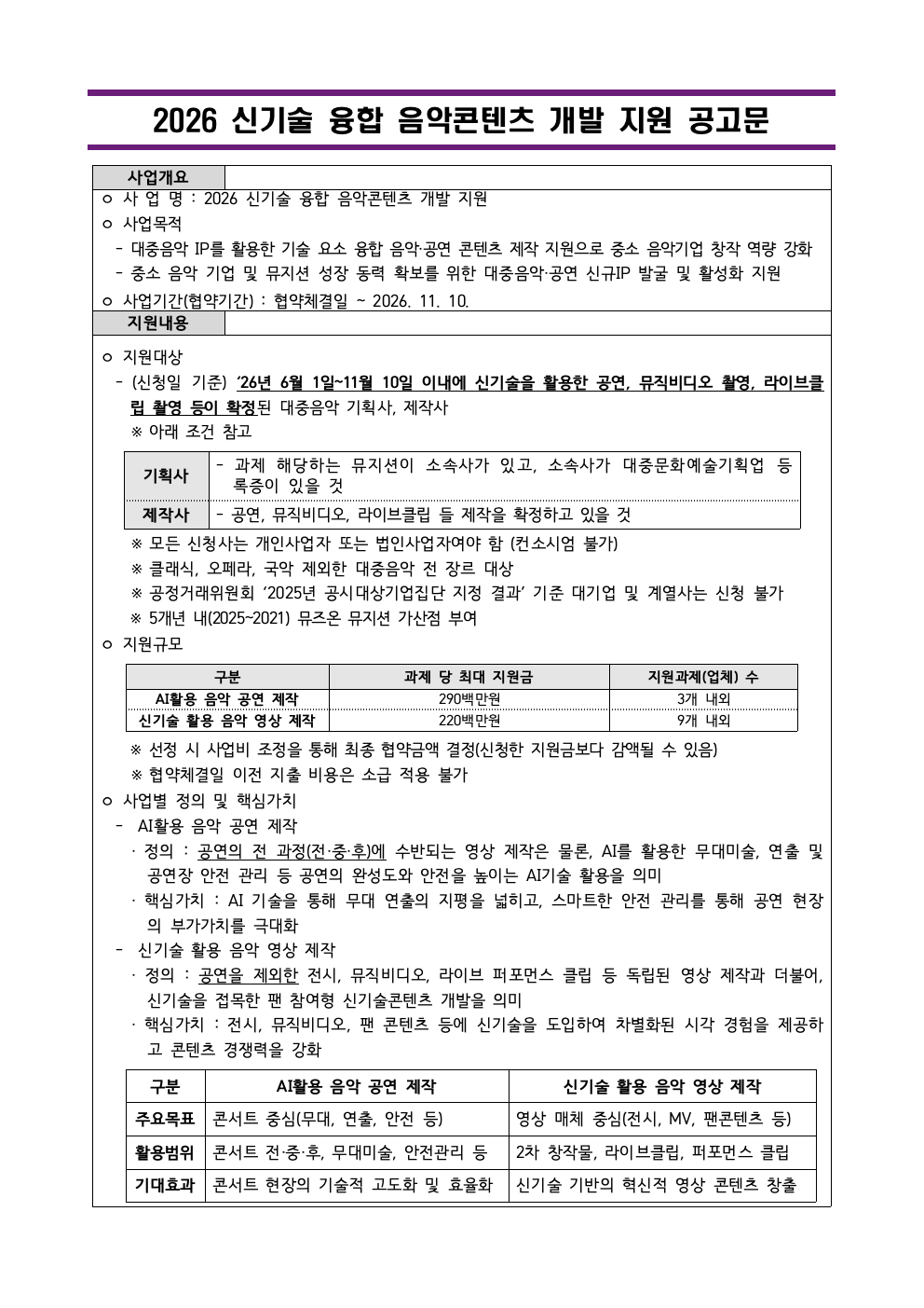 2026년 신기술 융합 음악콘텐츠 개발 지원