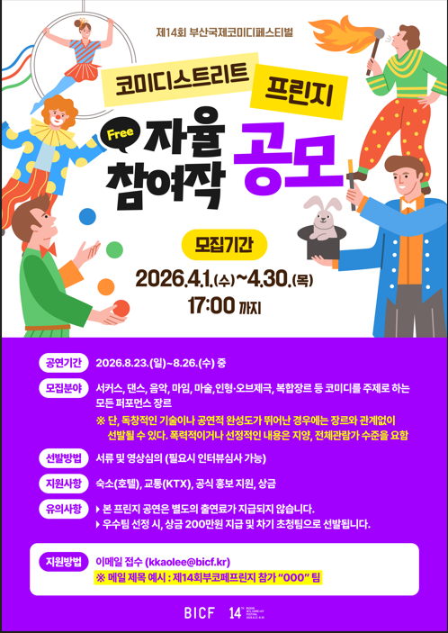 장 르 : 서커스, 댄스, 음악, 마임, 마술,인형·오브제극, 복합장르등 코미디를 주제로 하는 모든 퍼포먼스 장르 (단, 독창적인 기술이나 공연 완성도가 뛰어난 경우에는 장르와 상관없이 선발 가능, 폭력적이거나 선정적인 내용은 지양, 전체관람가 수준을 요함)