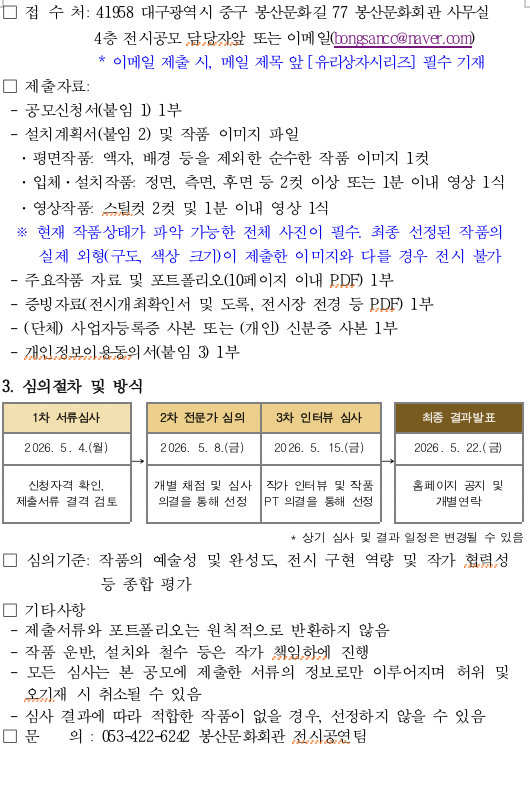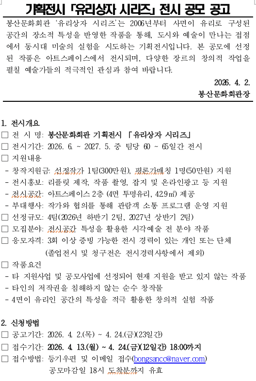 [봉산문화회관 공고 제2026-12호] 기획전시 <유리상자 시리즈> 전시 공모 공고